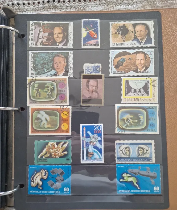 Collection of space exploration themed postage stamps. Features stamps from Ras Al Khaimah, Fujairah, Posta Romana, DDR, Mongolia, and Bulgaria. Images depict astronauts, spacecraft, and celestial bodies.