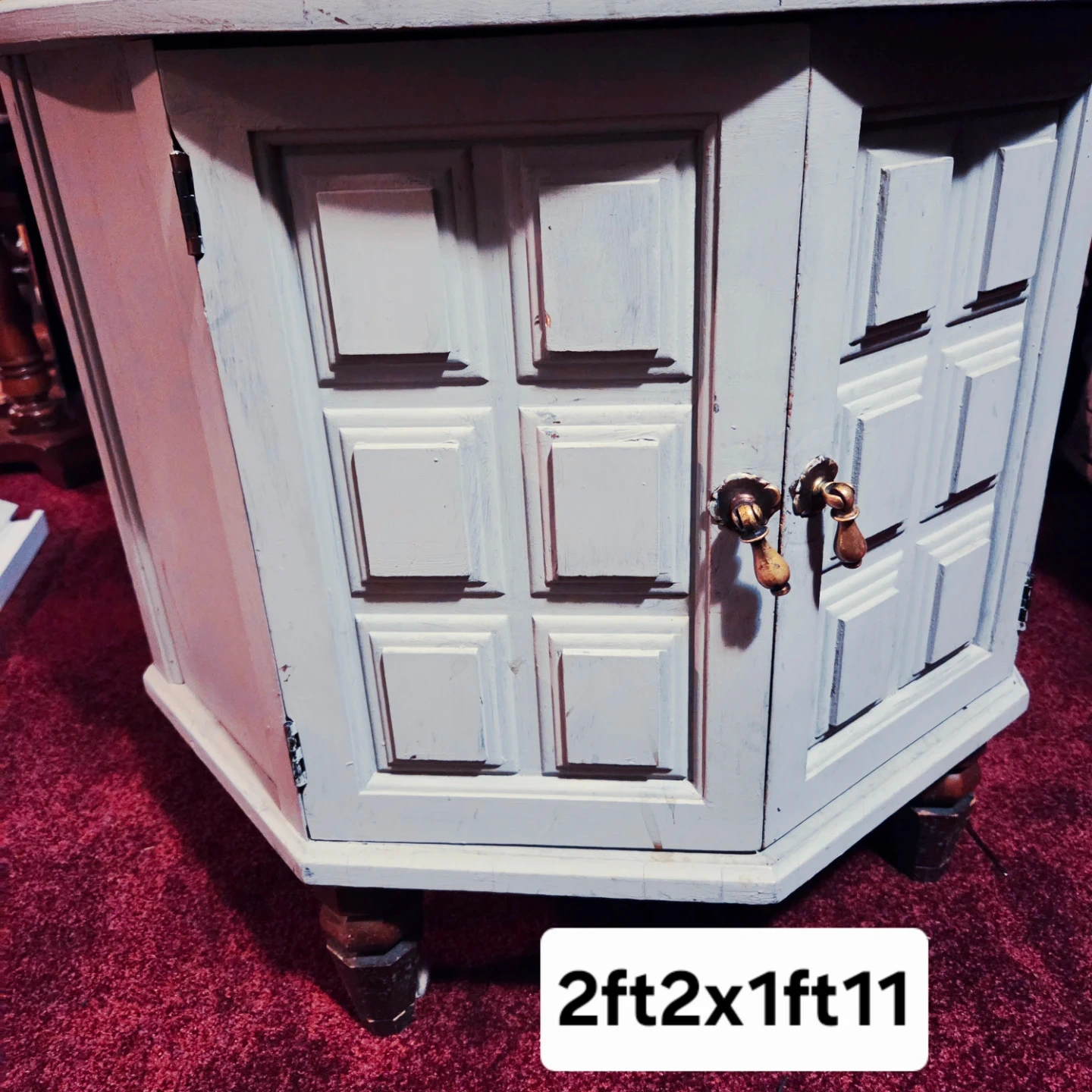 This is a vintage hexagonal side table with a light gray distressed finish and brass hardware. Its dimensions are 2ft 2in x 1ft 11in. It has a unique paneled door design with optimal storage and shelf inside.