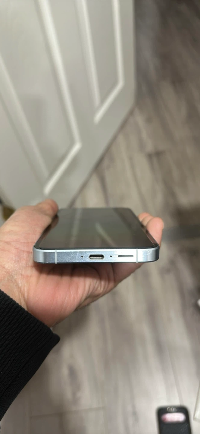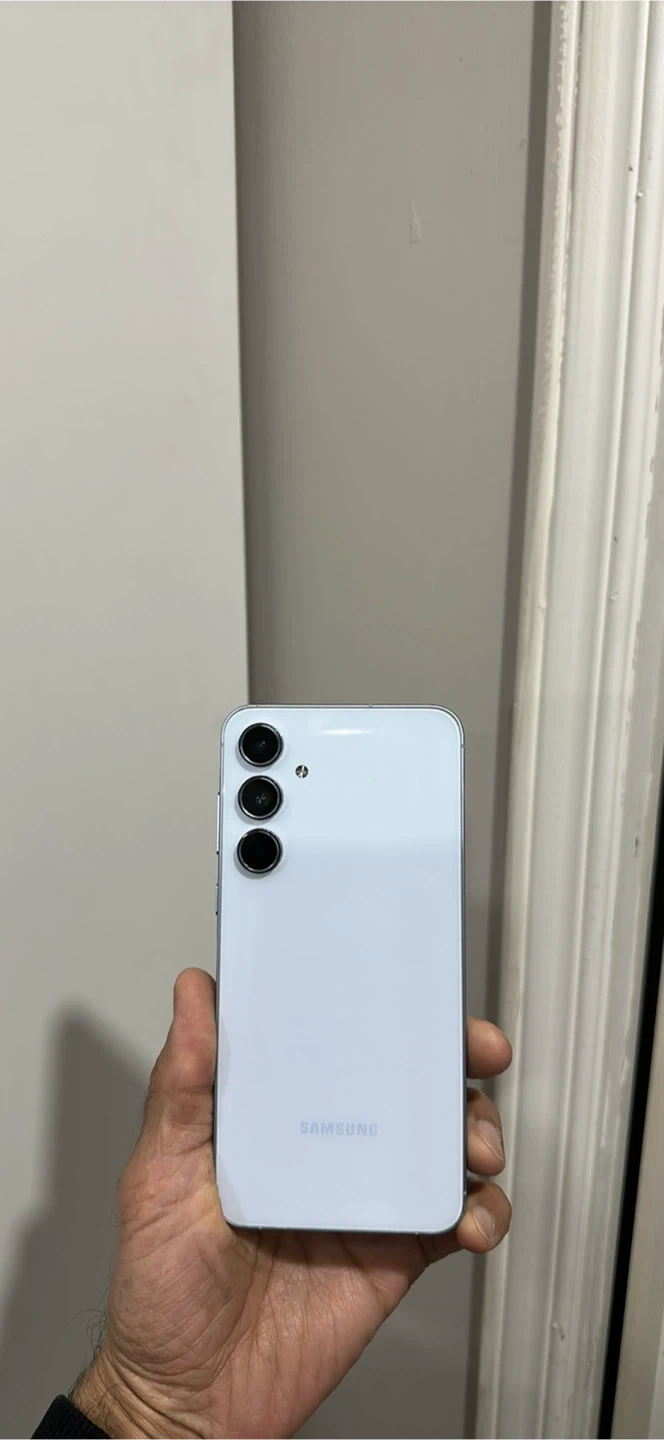 This is a Samsung Galaxy A55 5G smartphone. It's a white model with a silver frame. The phone features a USB-C charging port and a triple camera setup on the back.