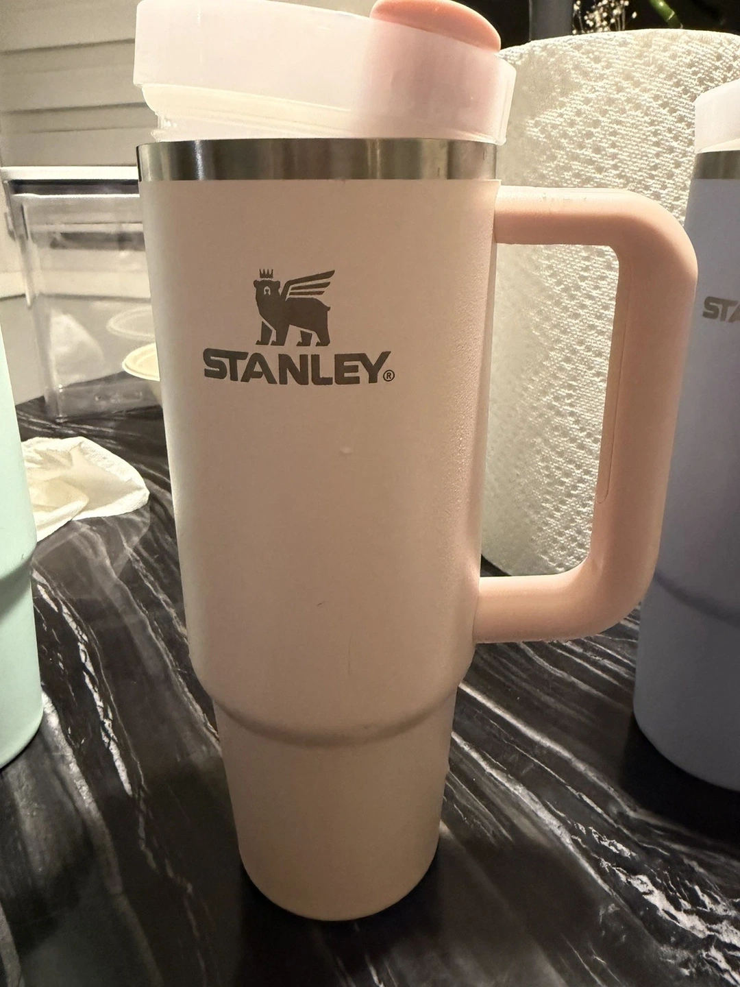 Used. Two-piece set of Stanley 30 oz. Quencher H2.0 tumblers in Pink Champagne. These are solid color, BPA-free plastic and stainless steel tumblers with a drink-through lid and handle. They keep beverages hot for 8 hours and cold for longer. Suitable for kids, teens, and adults. Features include insulation, a spill-proof lid, and a handle. Item height is 10.8 inches and width is 5.4 inches. Country of Origin: China.