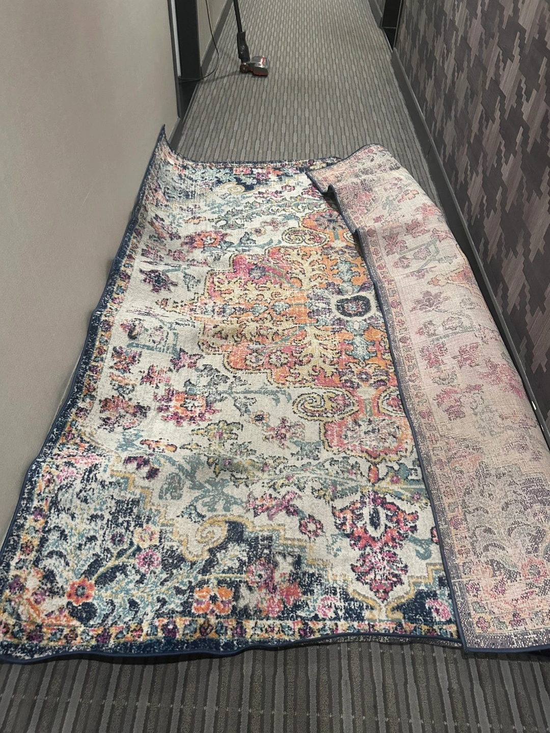 Colorful distressed oriental style area rug. Features a faded floral and paisley pattern with a navy border. Its vintage-inspired design adds a touch of charm to any room. Suitable for living rooms or bedrooms.