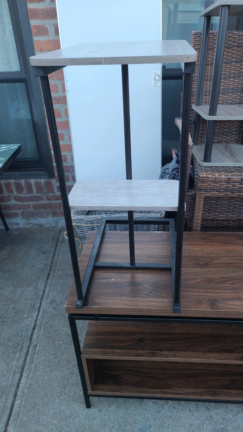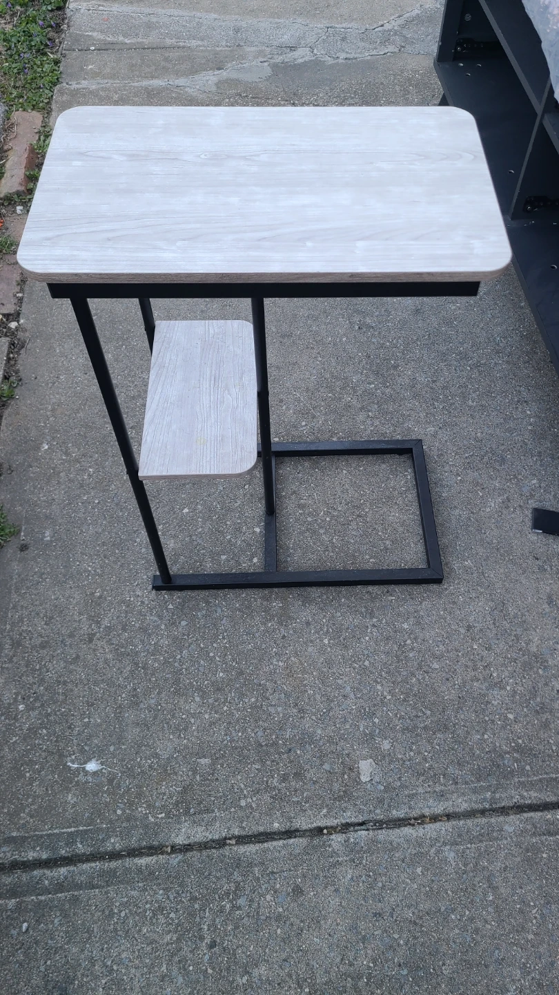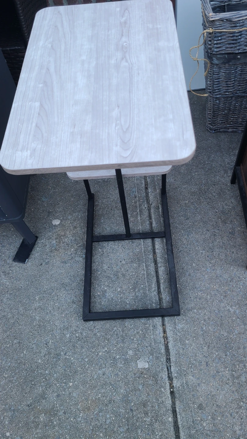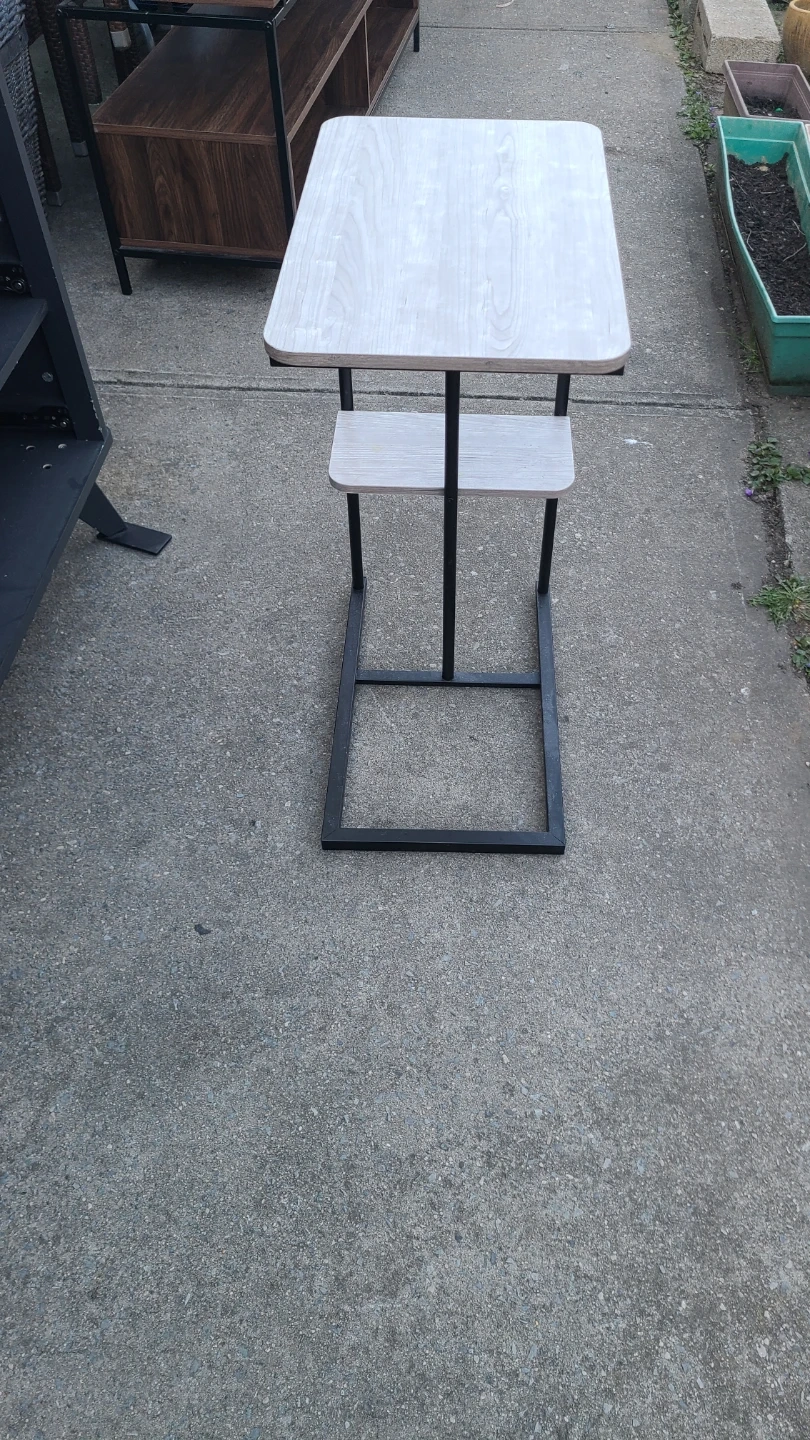 This C-table features a light wood finish top and a lower shelf. It has a sturdy black metal frame with a C-shaped base, perfect for sliding under a sofa or chair. The dimensions are approximately 19 inch long by 12 inch wide by 26 inch high