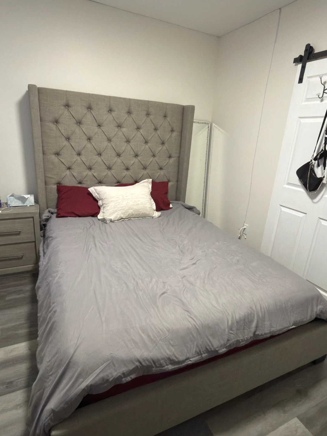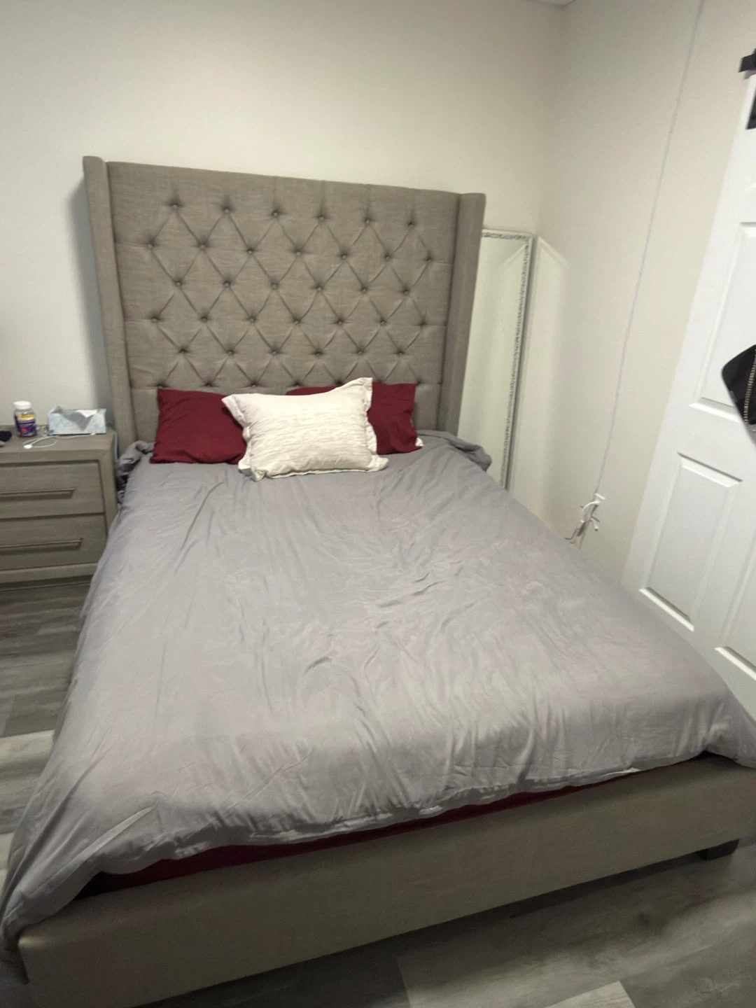 This is a tufted wingback upholstered bed frame with a tall headboard. It has a diamond-tufted design and a wingback silhouette. Upholstered in a neutral gray fabric. Bed frame only, mattress not included.