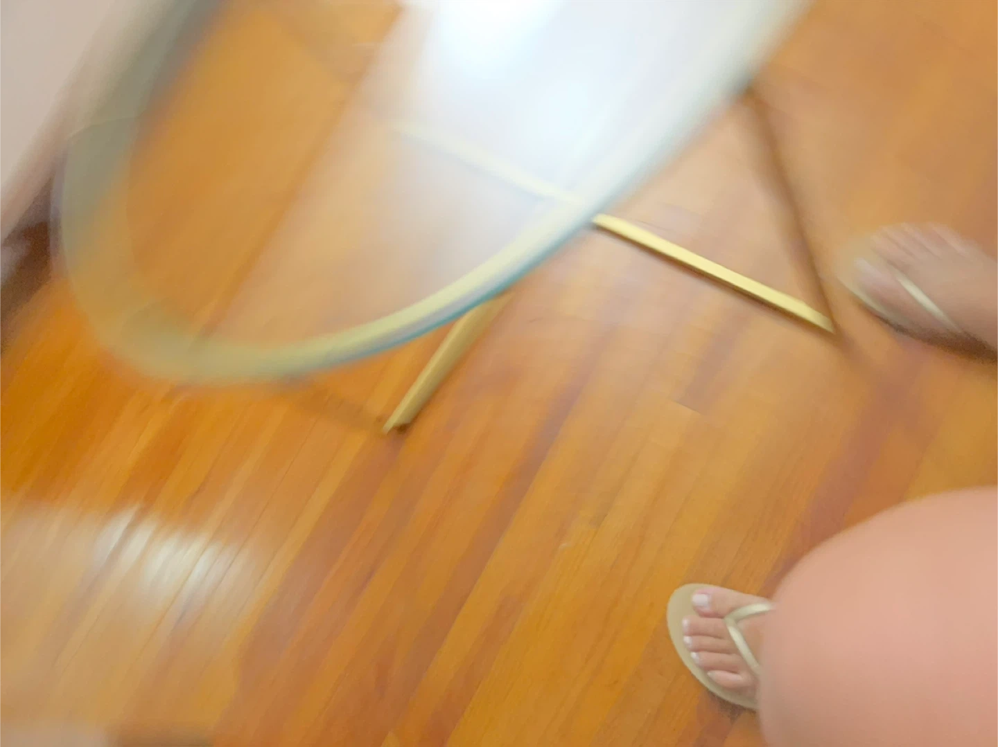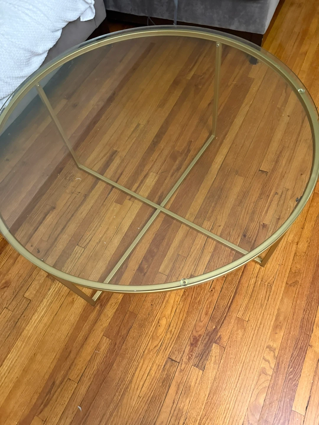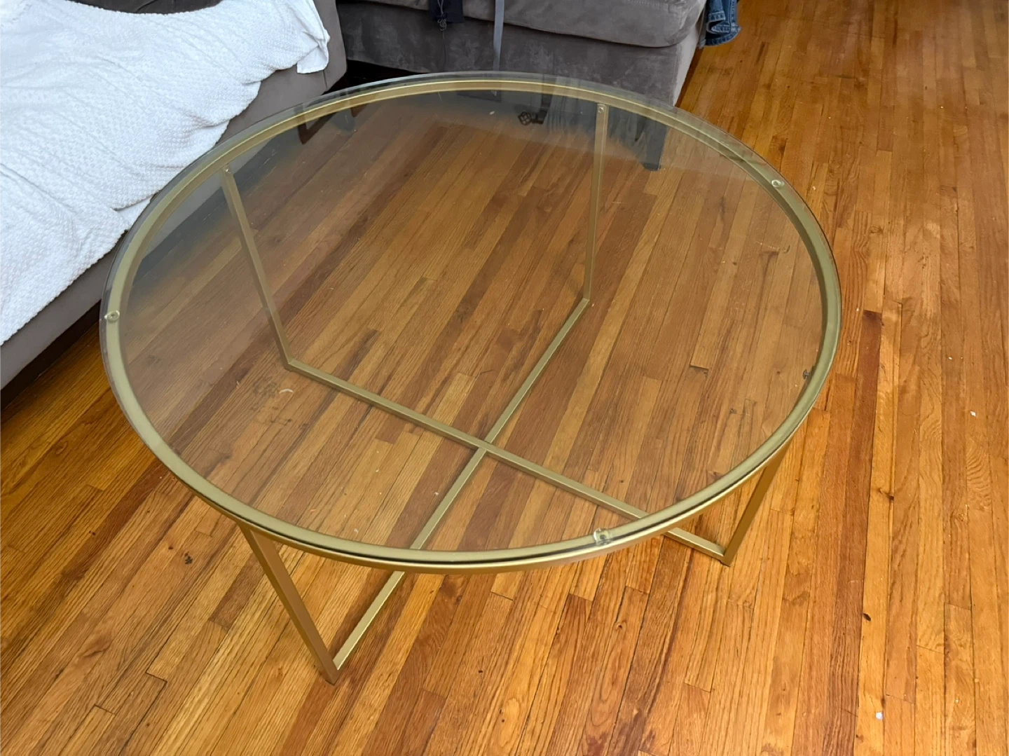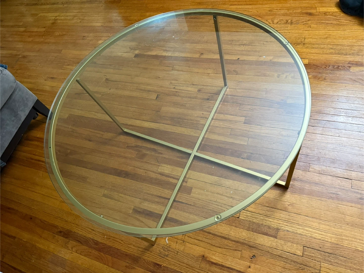 This coffee table features a clear glass top and a gold-tone metal frame. Its round shape and open base give it a modern look. This table's design makes it a stylish addition to a living room.