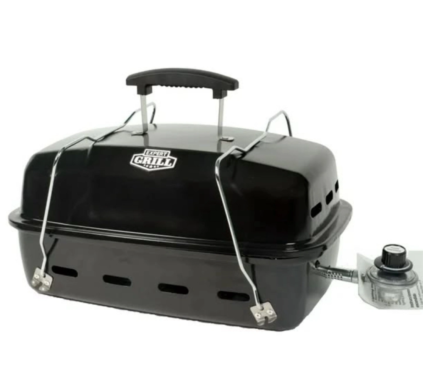 Compact tabletop gas grill. Perfect for balconies or small spaces. Features a carry handle and foldable legs. Shows minor signs of use.