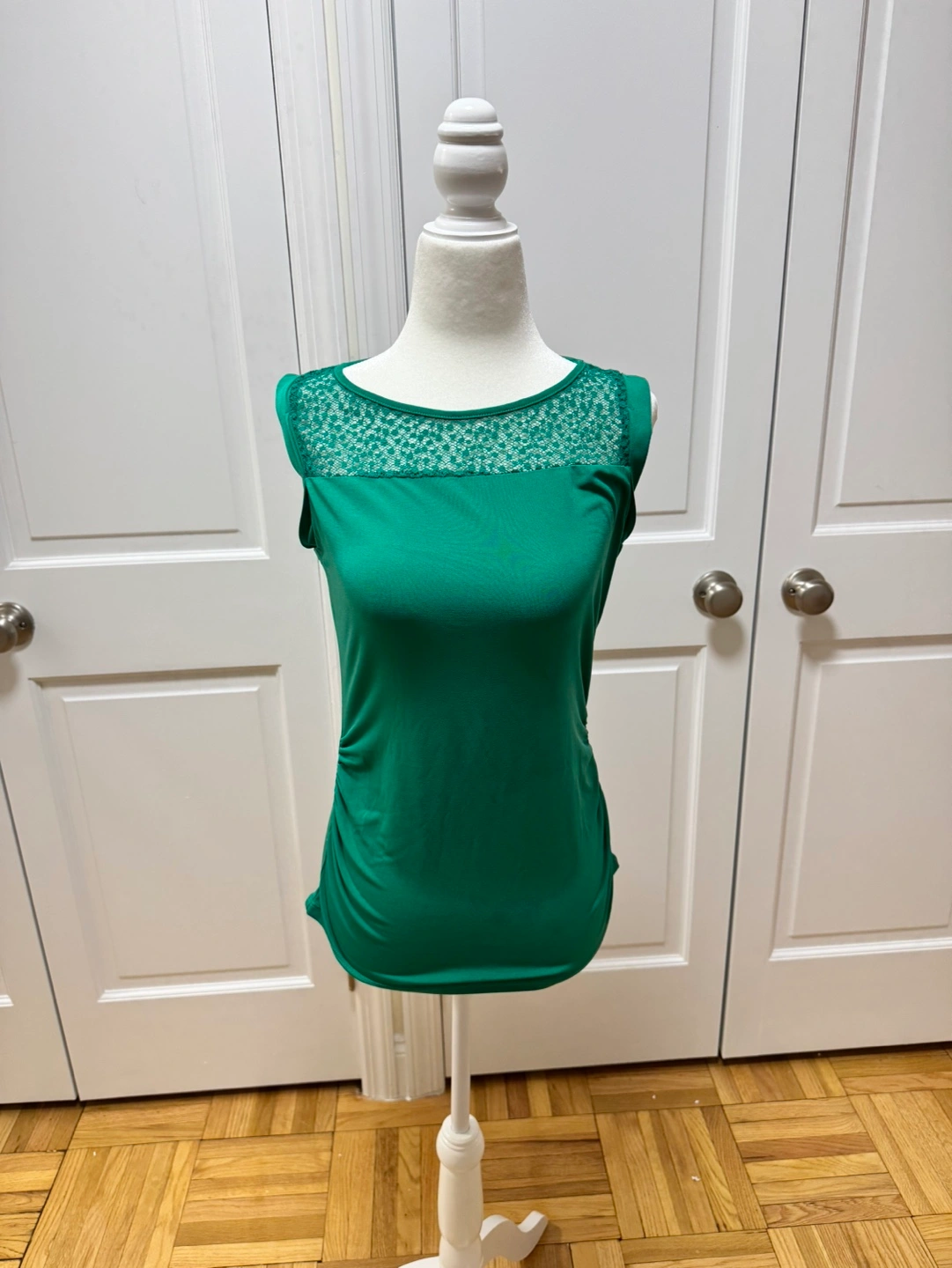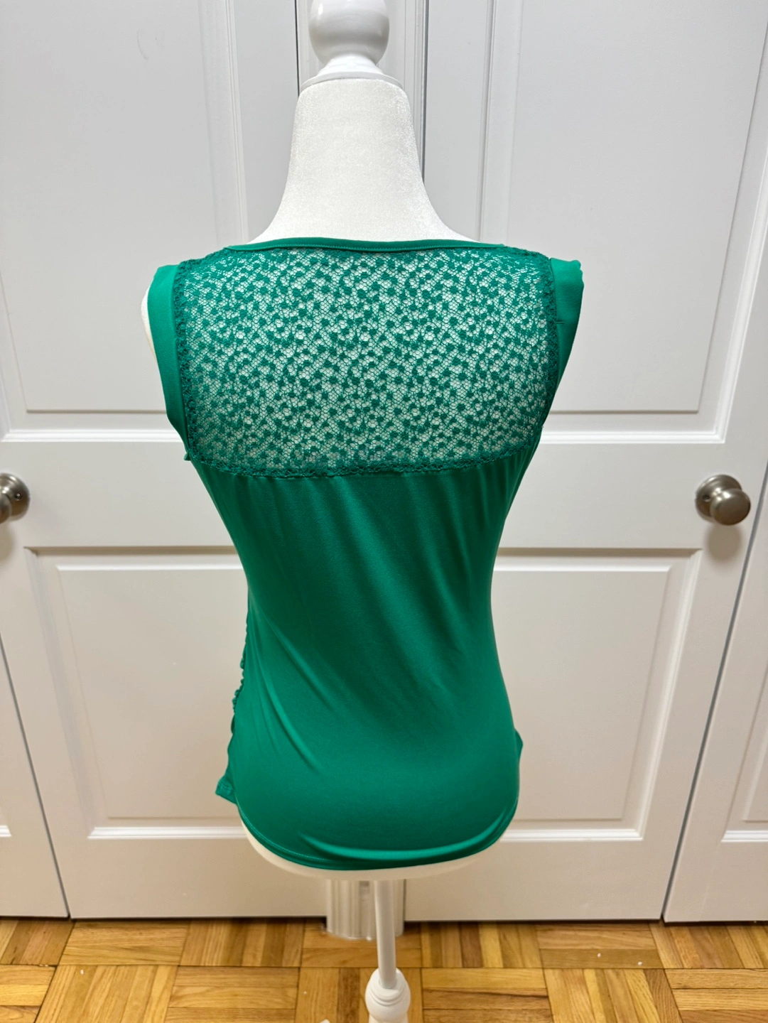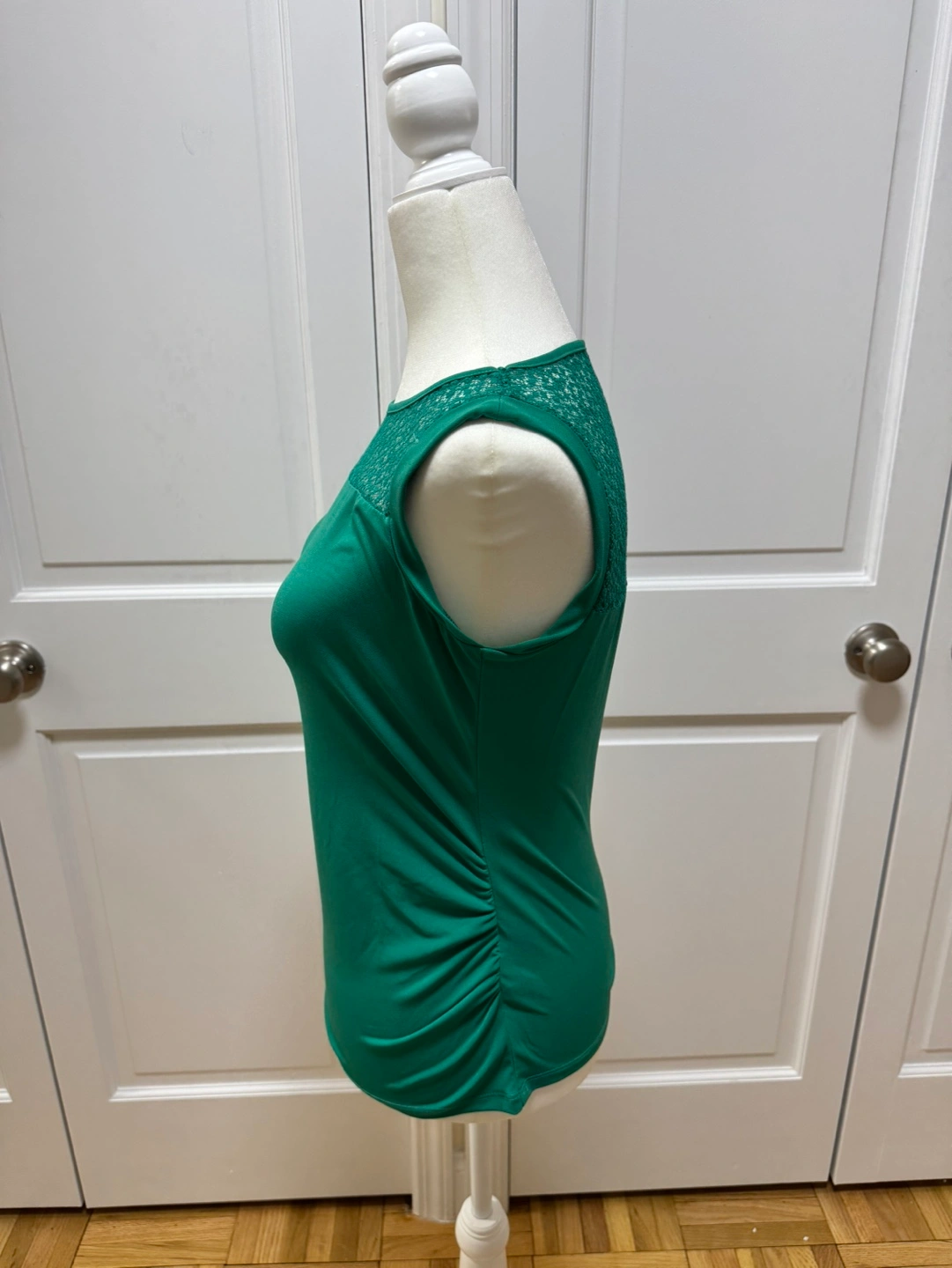 Women's green sleeveless top. Features a lace insert at the neckline. Ruched detail at the sides. Size XS.