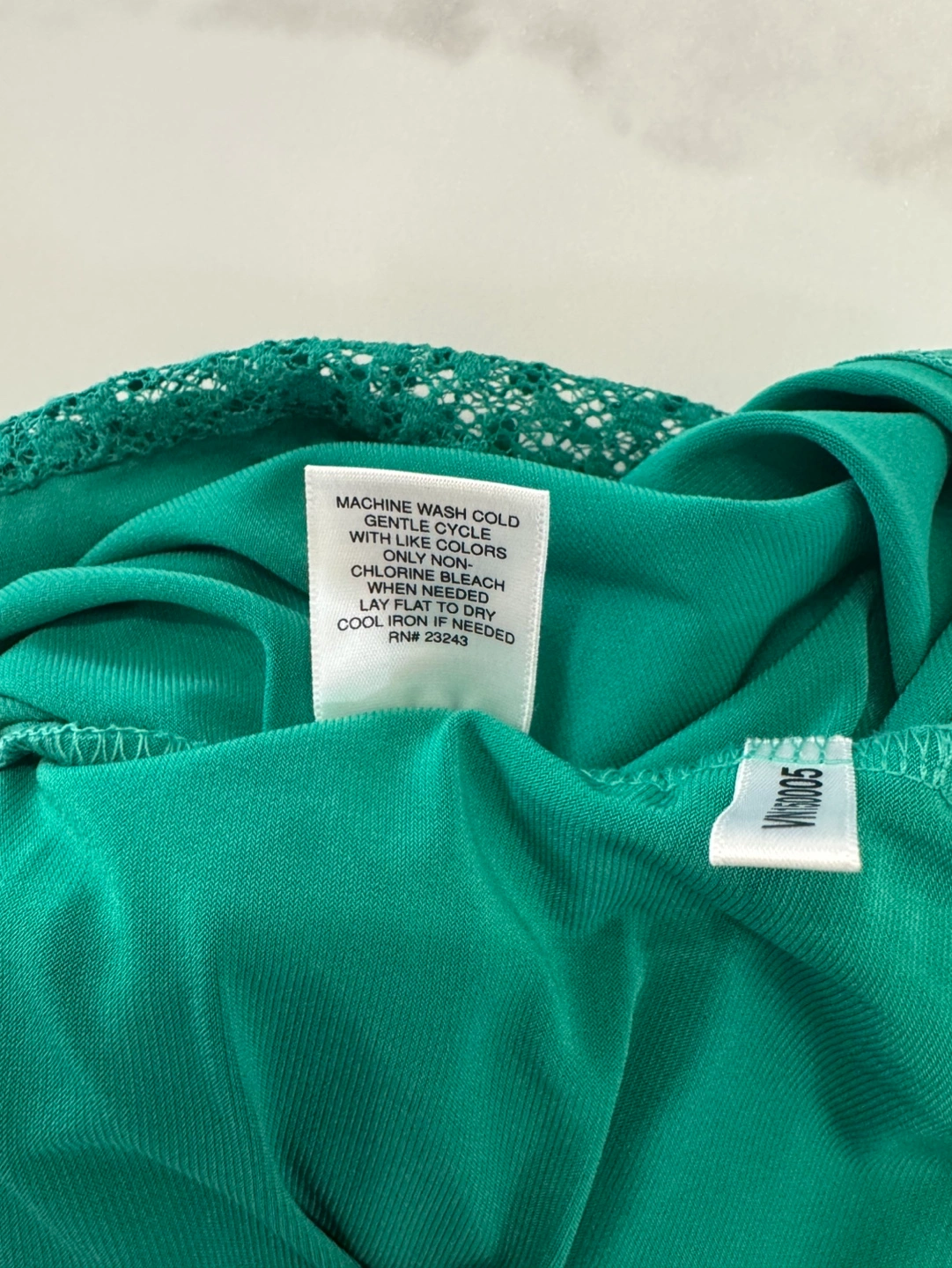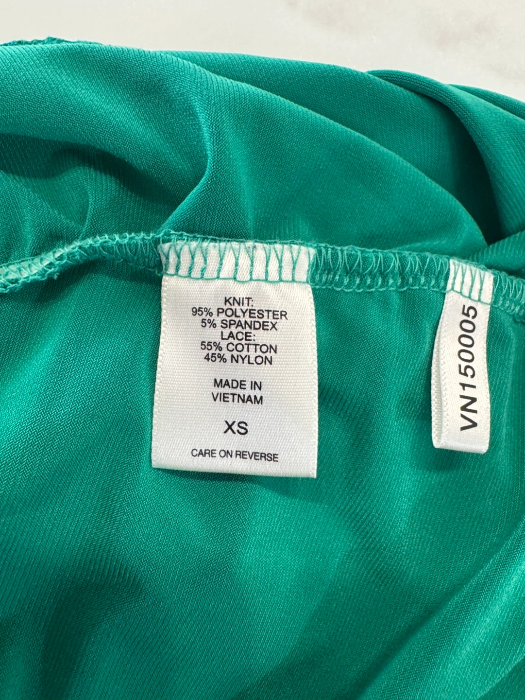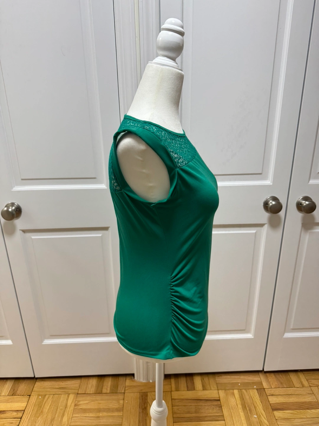 Women's green sleeveless top. Features a lace insert at the neckline. Ruched detail at the sides. Size XS.