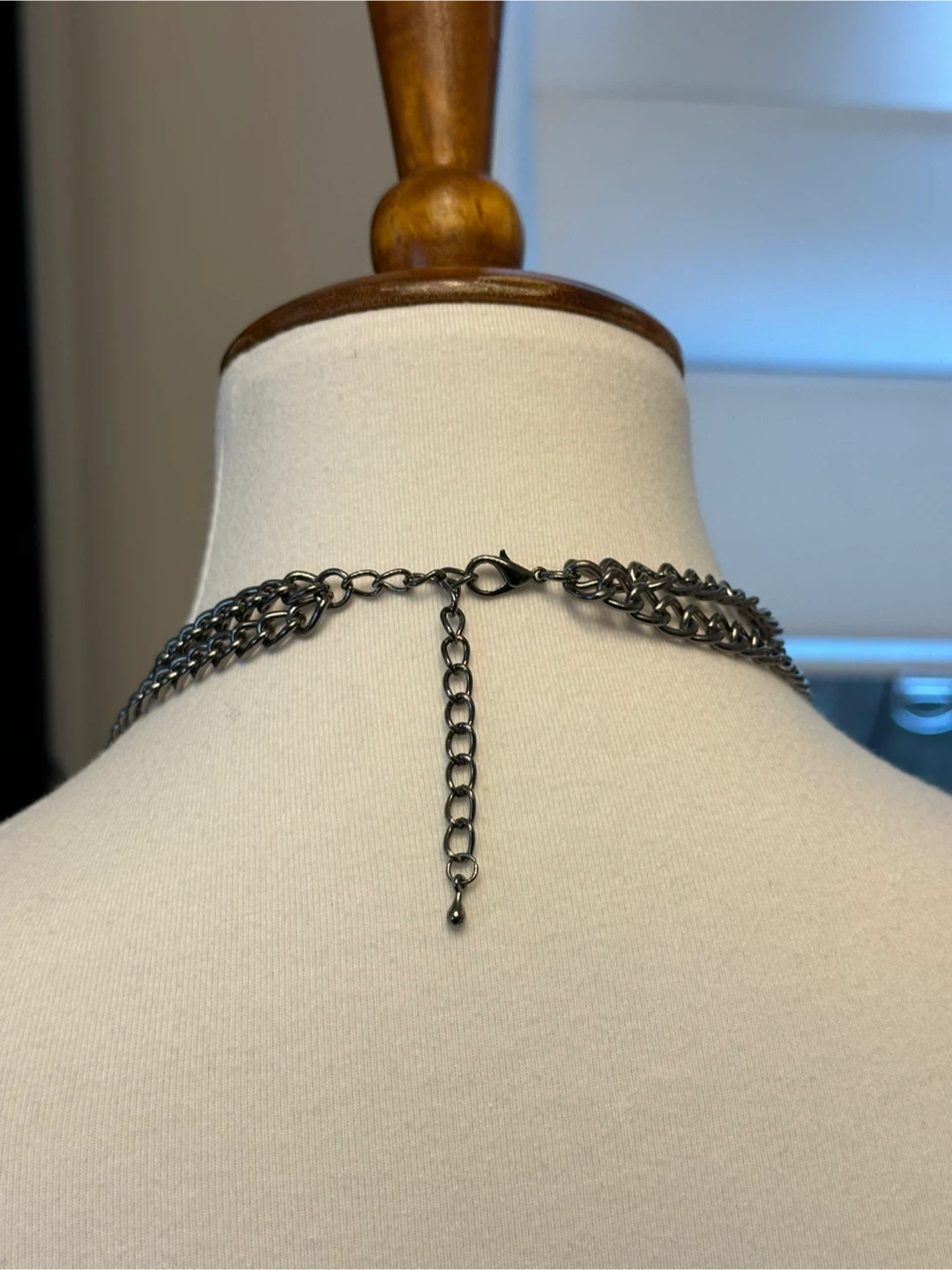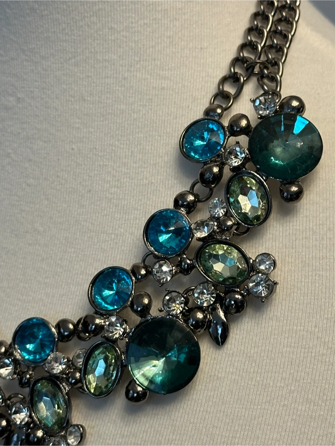 Beautiful statement necklace featuring teal and turquoise colored stones. It has a gunmetal colored chain and is in great condition! Adjustable length . Perfect for adding a pop of color to any outfit