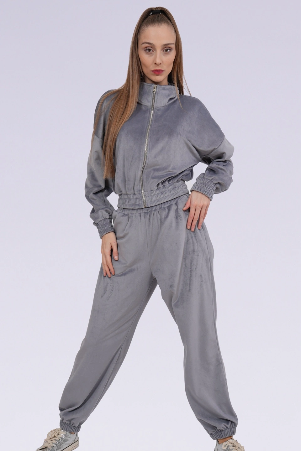 Brand new ! This is a two-piece velour tracksuit set in a classic grey colour. It features a full-zip jacket with a mock neck and elasticated cuffs and hem. The matching pants have an elastic waistband and cuffs. Velour material.