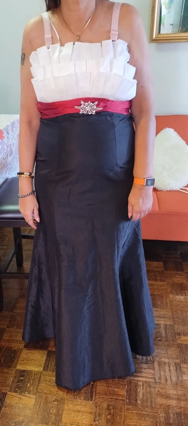 This elegant strapless maxi dress features a ruched red satin waistband adorned with a sparkling rhinestone brooch. It's a beautiful black fishtail skirt. Perfect for formal events or galas!