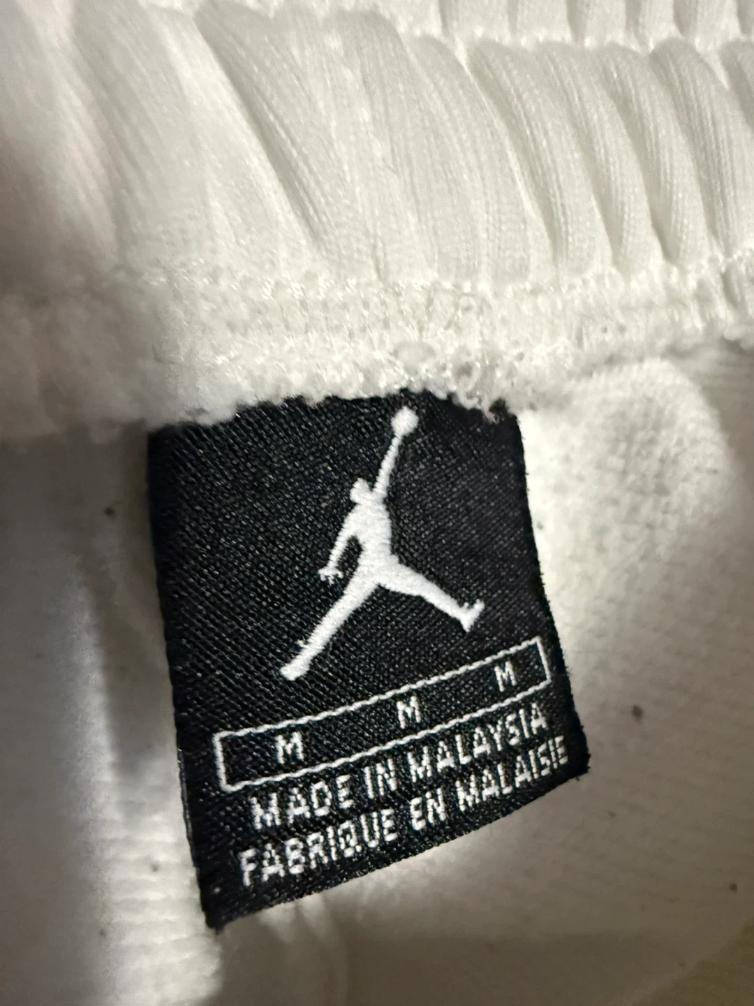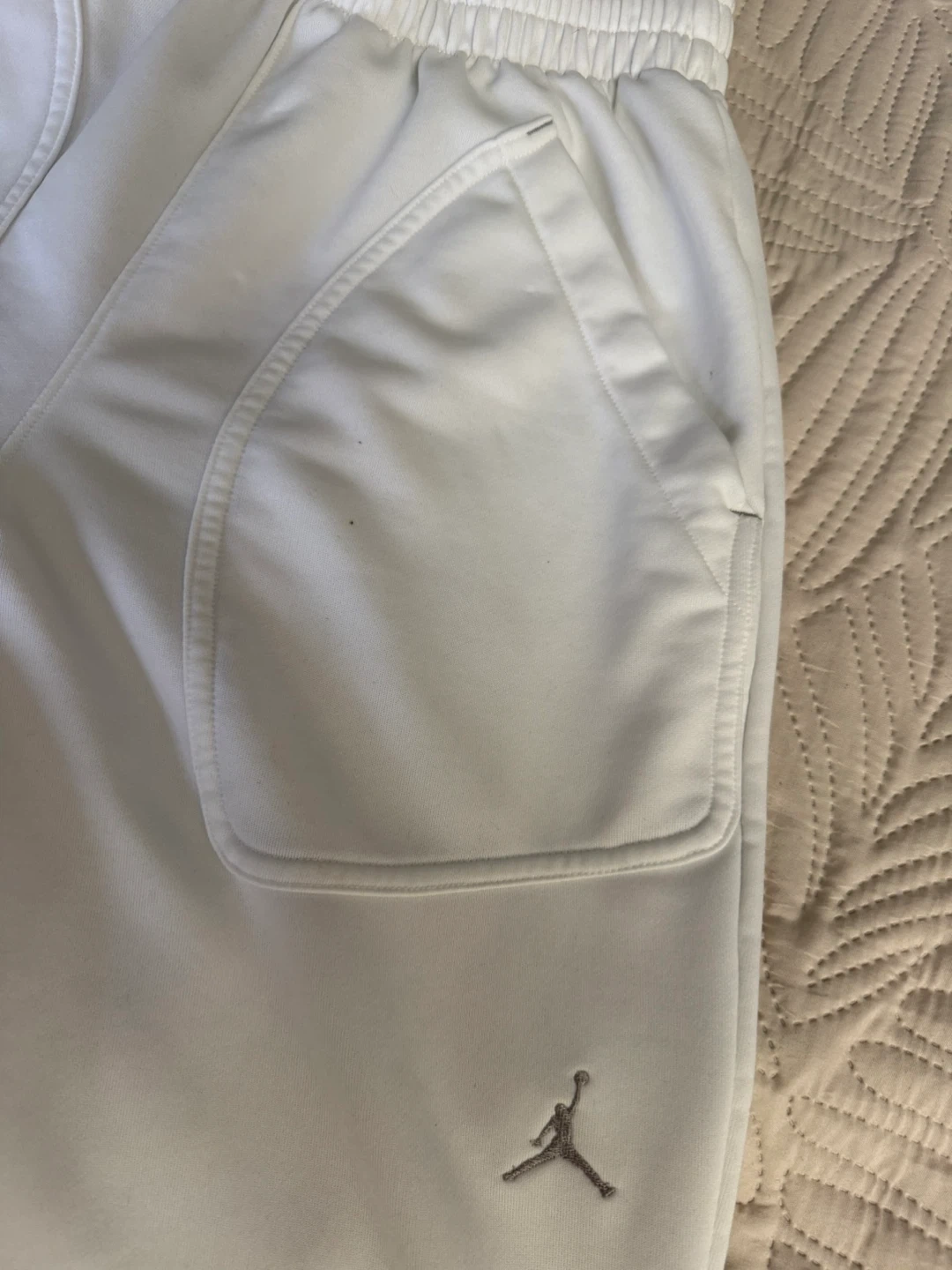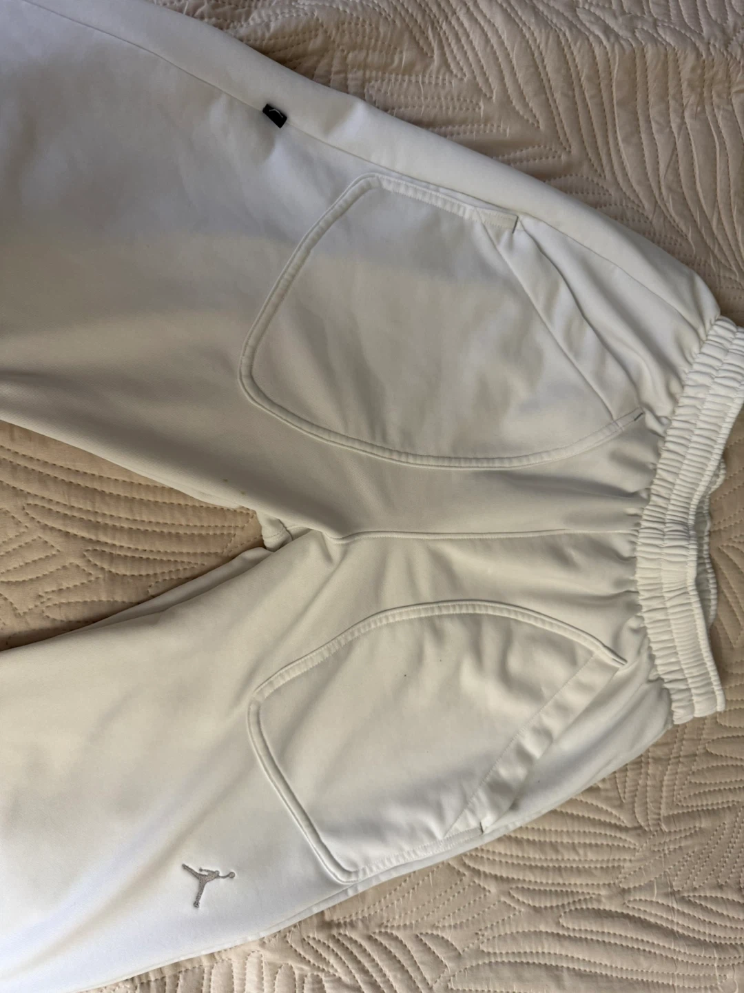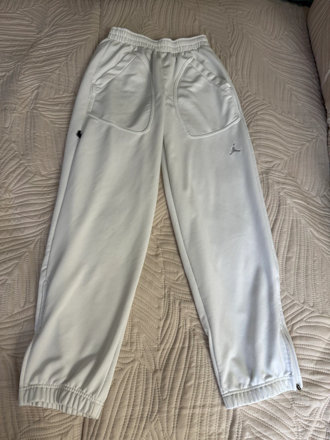 These are white Jordan sweatpants with zippered ankles. They have the Jordan logo embroidered on the leg. Elastic waistband for comfort.