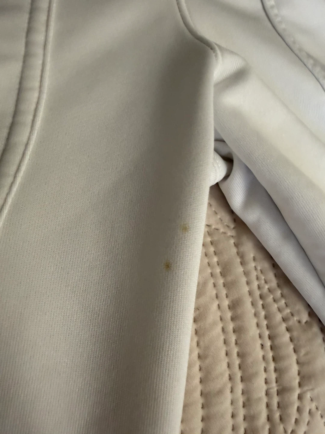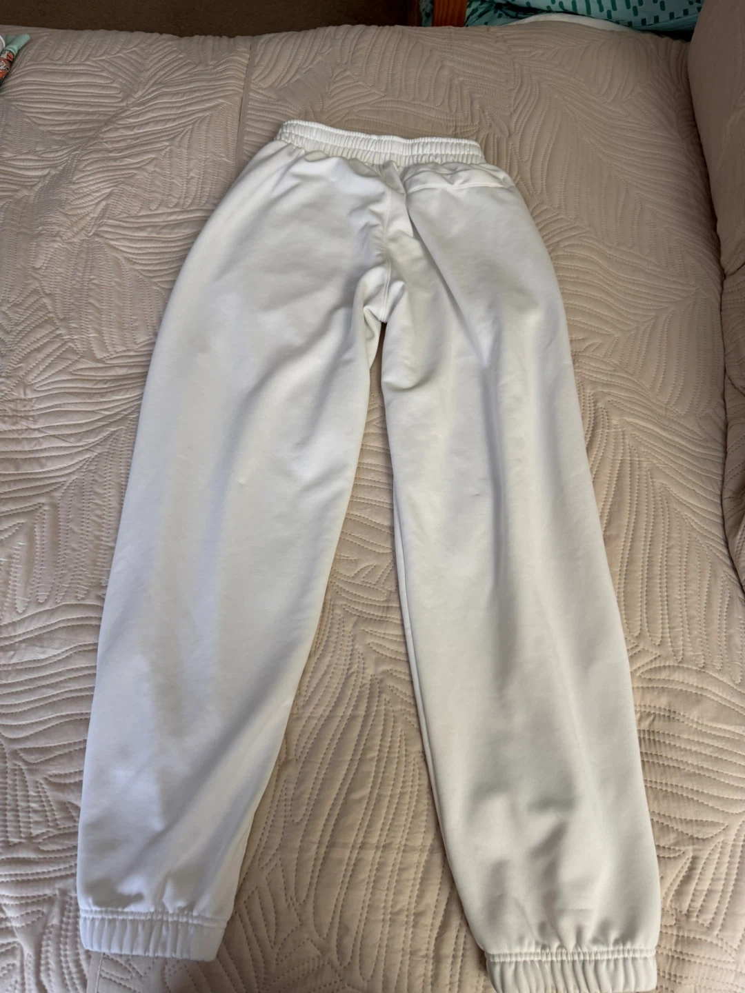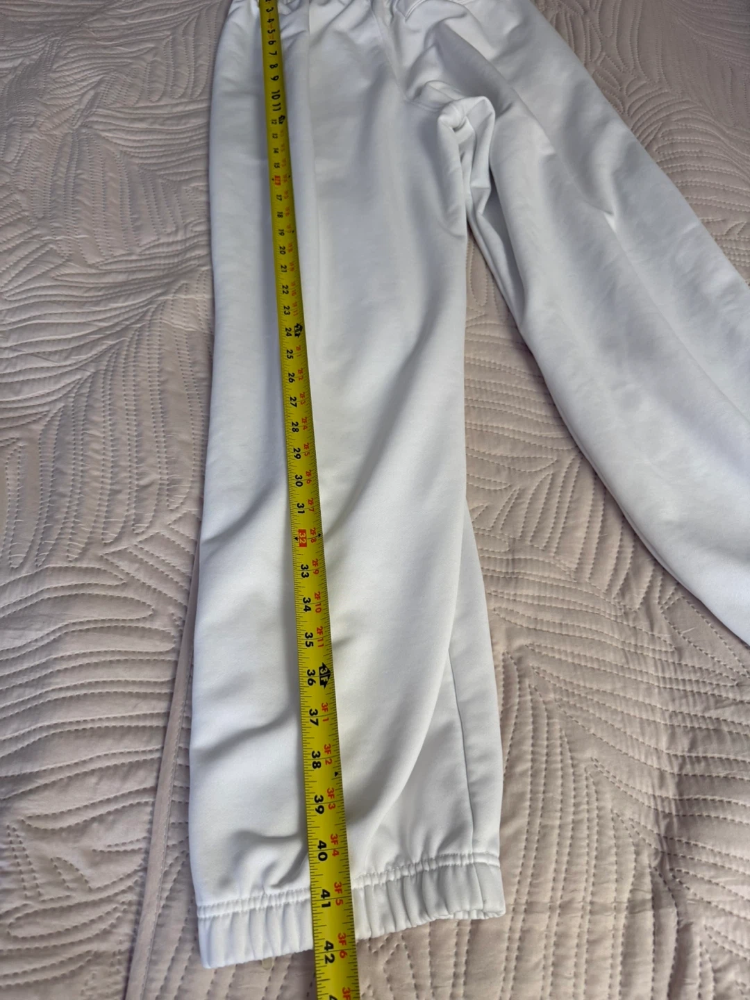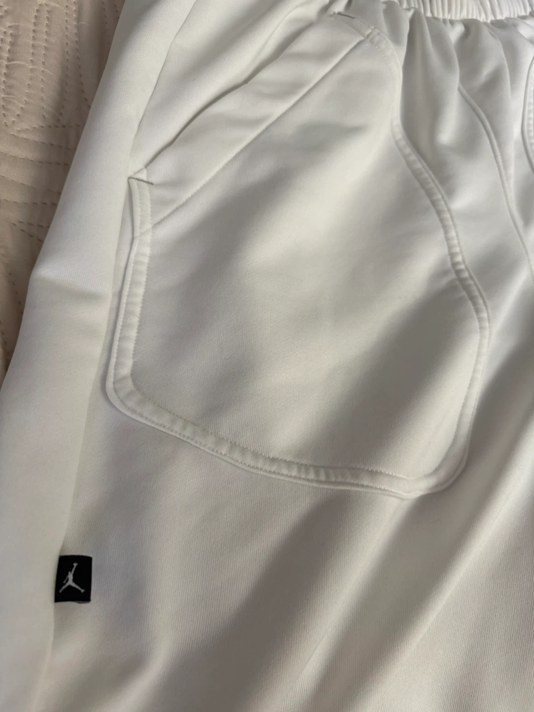 These are white Jordan sweatpants with zippered ankles. They have the Jordan logo embroidered on the leg. Elastic waistband for comfort.