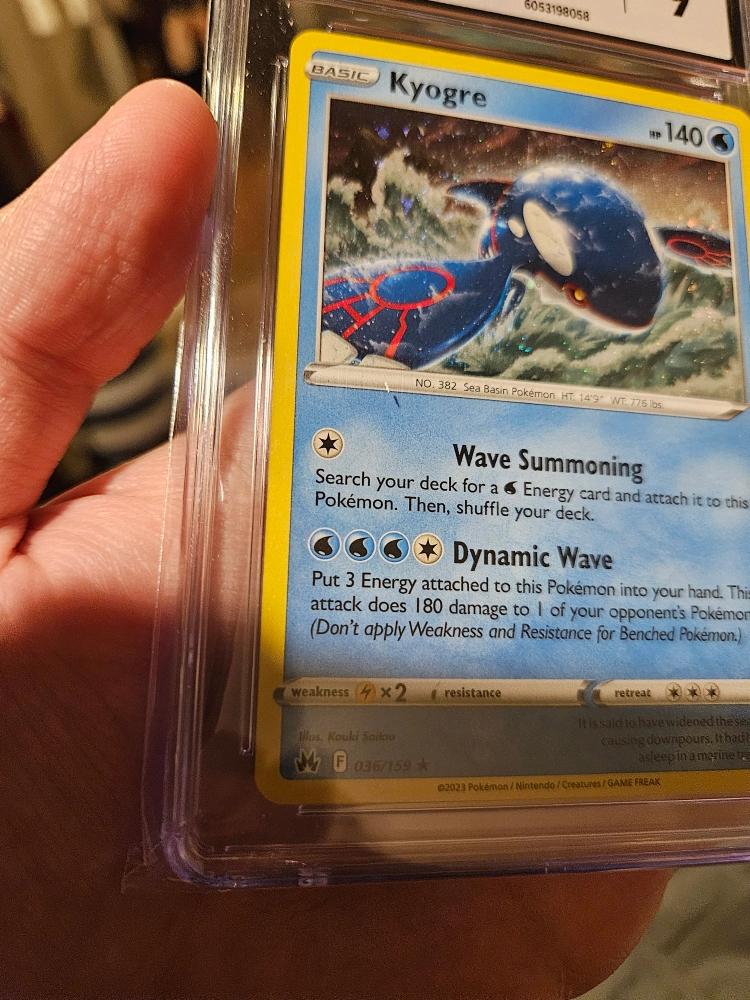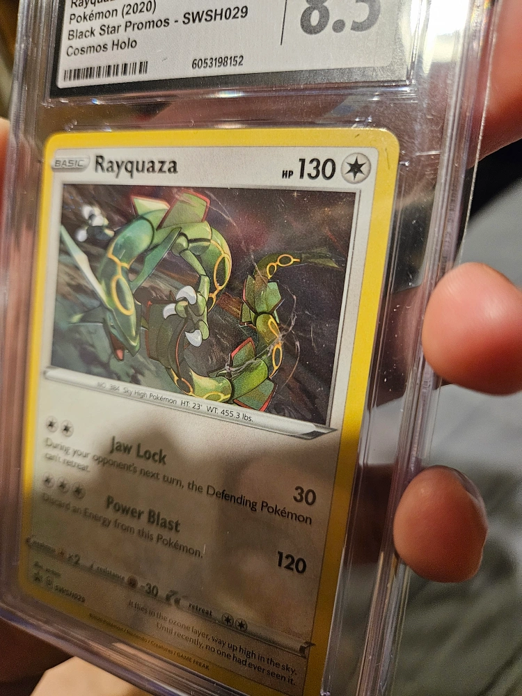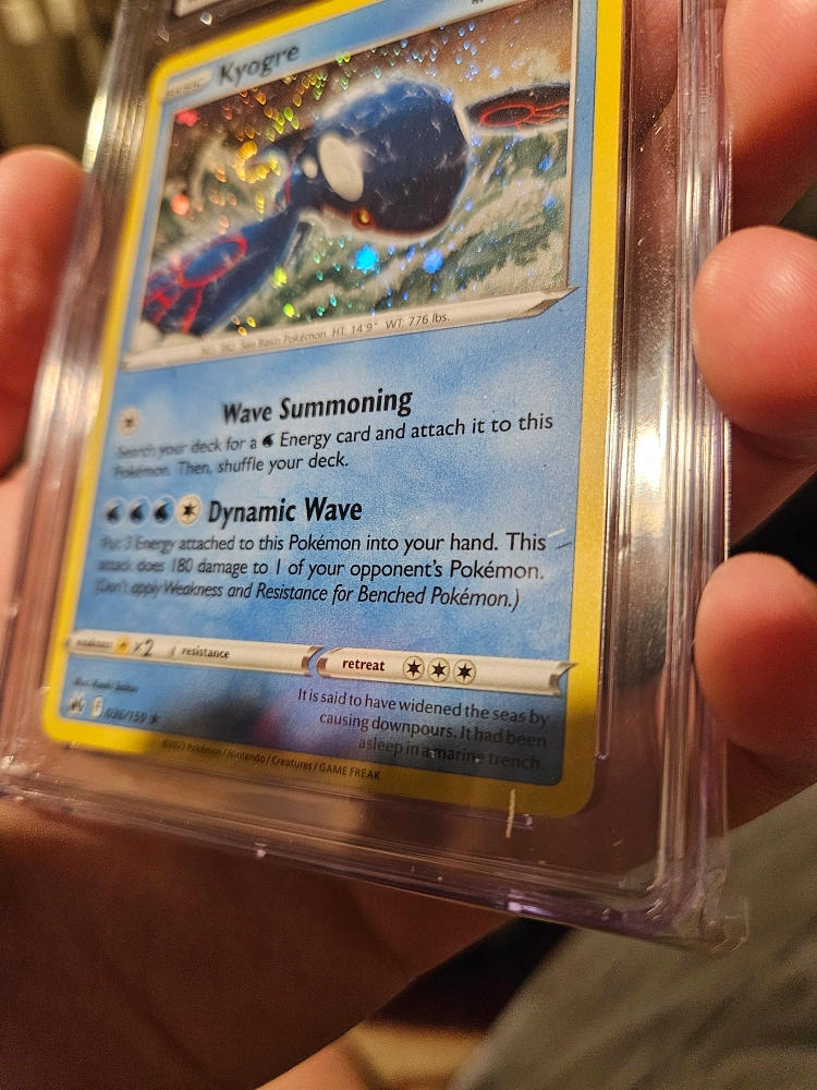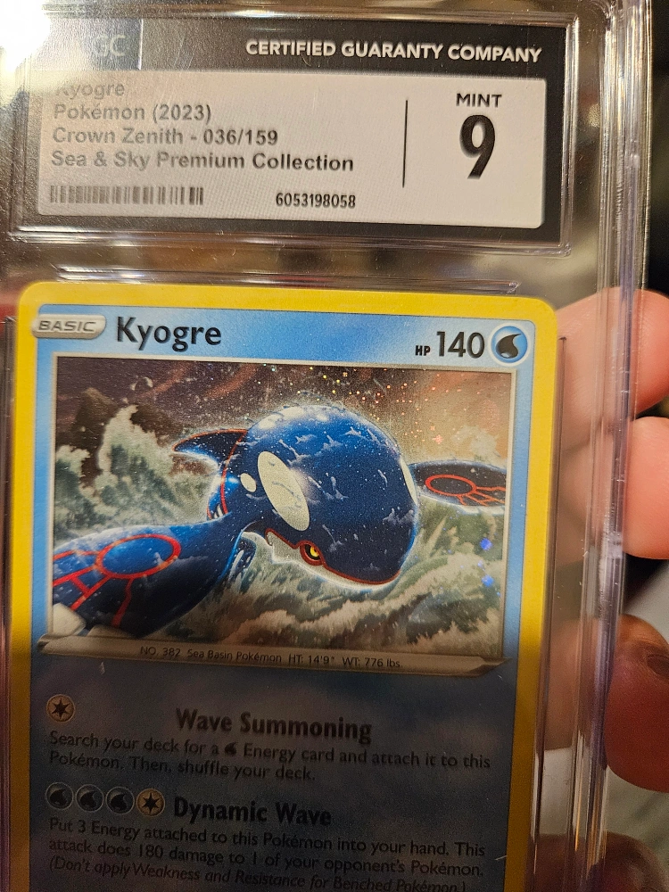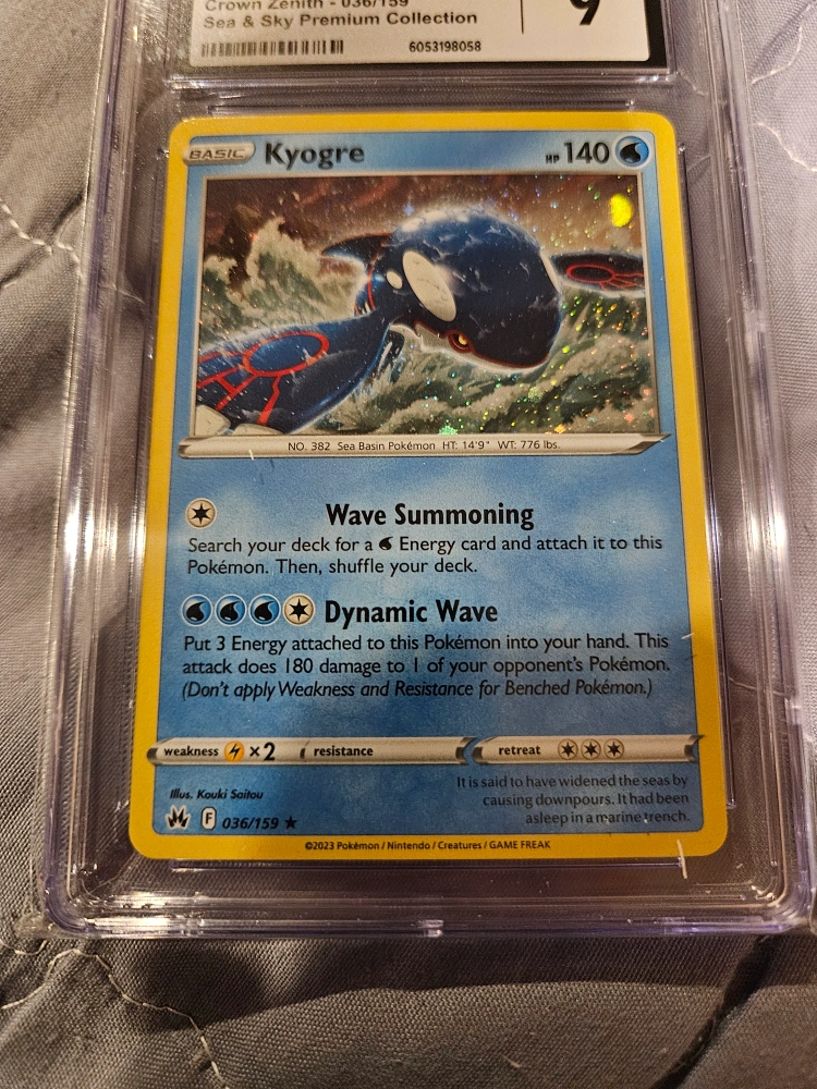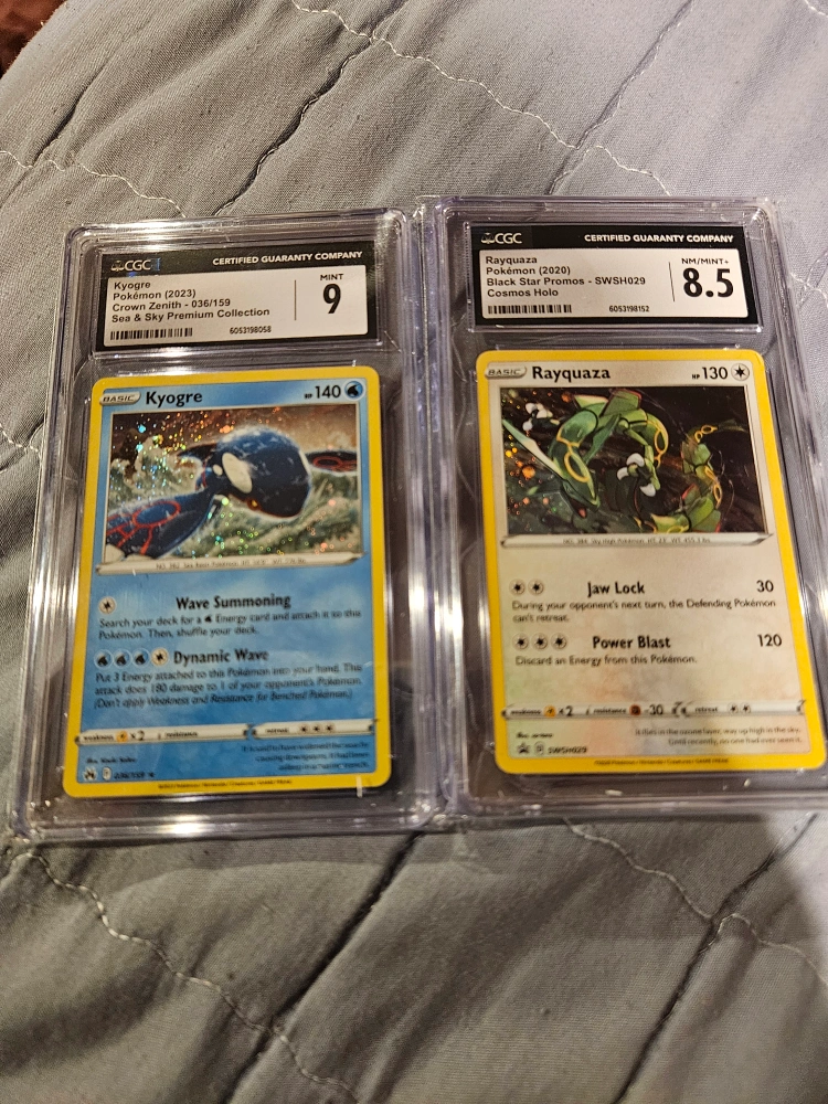 I'm selling two CGC graded Pokemon cards. One is a Kyogre from Crown Zenith (2023), graded Mint 9. The other is a Rayquaza from Black Star Promos (2020), graded NM/Mint 8.5 I have been wanting to sell these for a while & I'm always going to listen to "Best-Offers!" Please don't try to convince me to ship this out to you, and please don't try to convince me into paying me with "Cash-App," "QuickZelle," or "Venmo." I'm only accepting "cash" & "cash" only; additionally, I'm only meeting for local pickups & shipping this out does not work for me!!!!