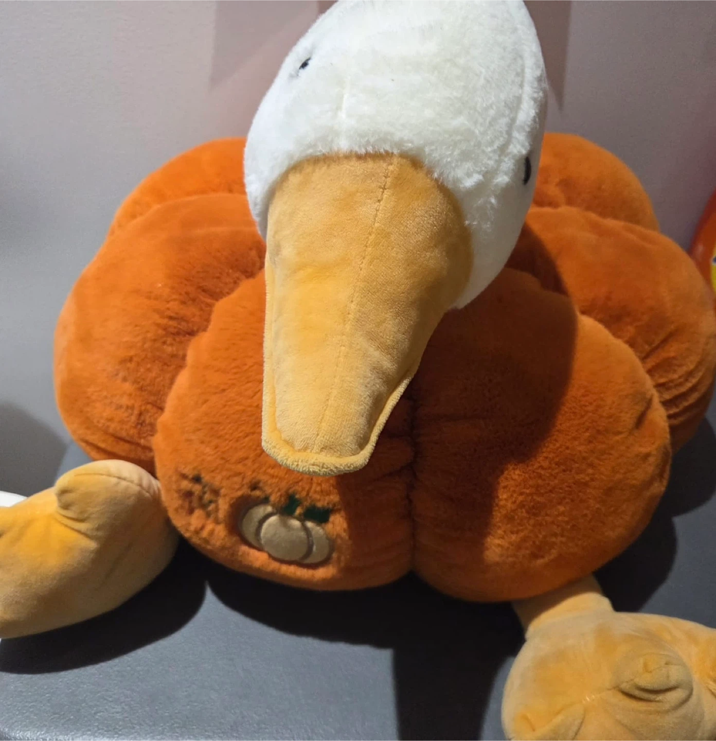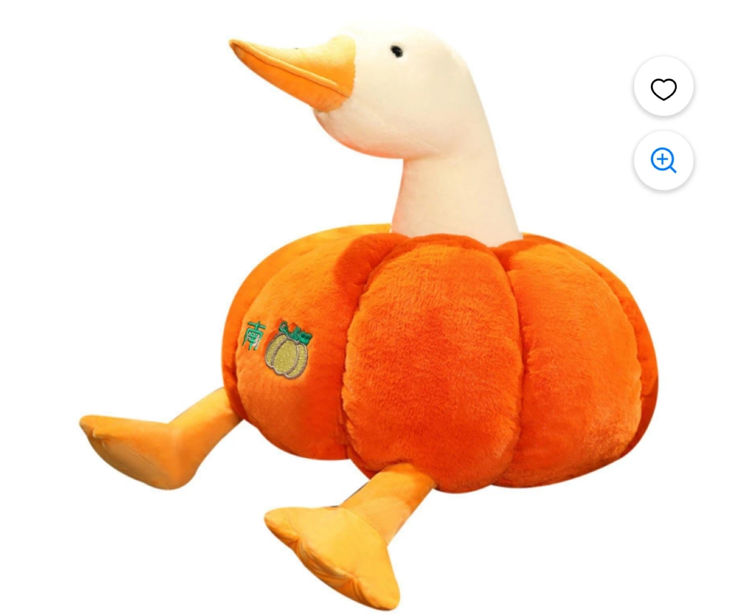 Adorable pumpkin duck plush — a cute and quirky stuffed toy perfect for fall décor or as a cozy cuddle companion.