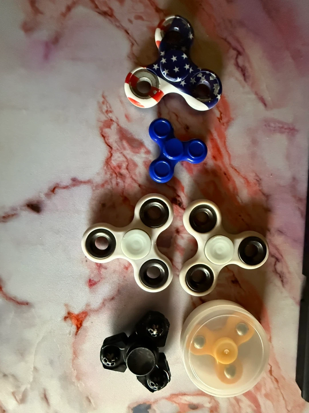 Set includes a US flag themed spinner, a blue plastic spinner, two white spinners with black bearings, and a black metal spinner. Also includes a clear plastic case with an orange spinner inside. Good for fidgeting and stress relief!