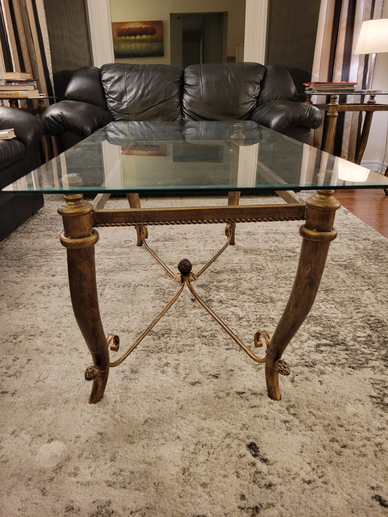 Selling a gently used glass top coffee table in excellent condition. The table features a clear glass top and ornate metal legs with a gold finish.