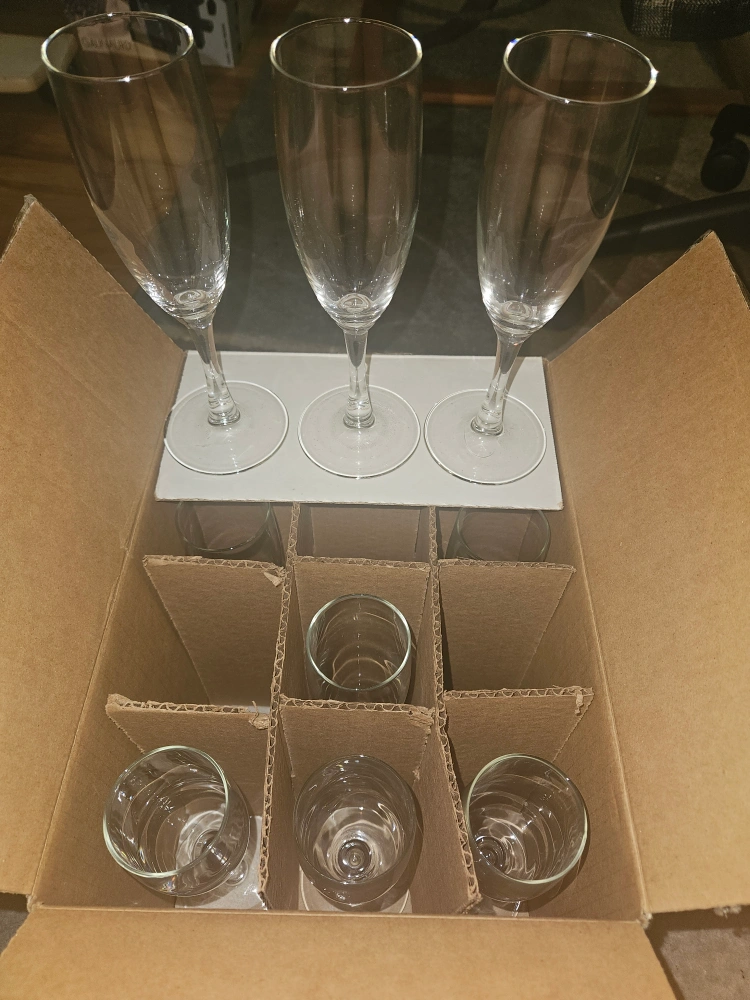 128Set of 12 champagne glasses in a box. Three glasses are out of the box, nine glasses are in the box.