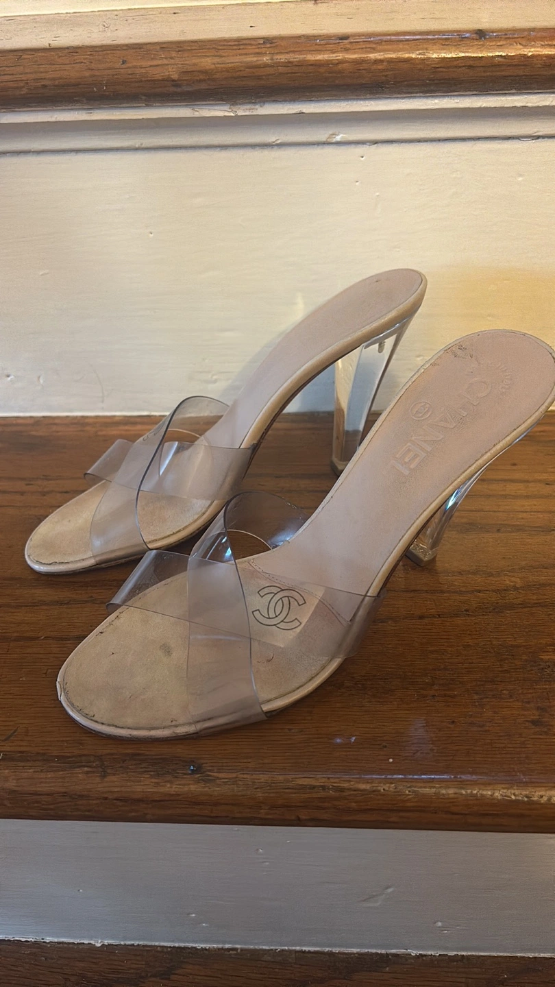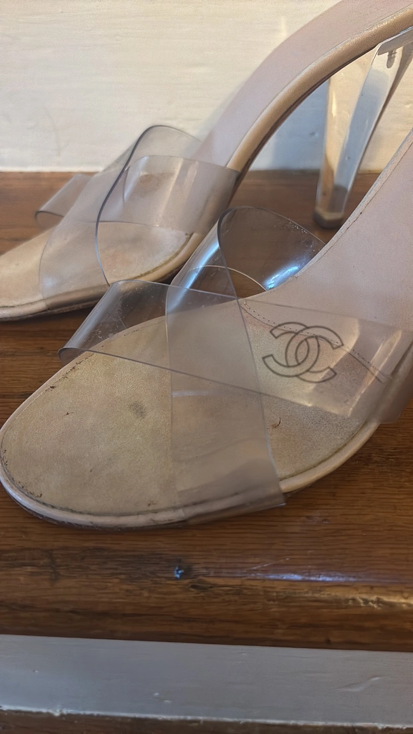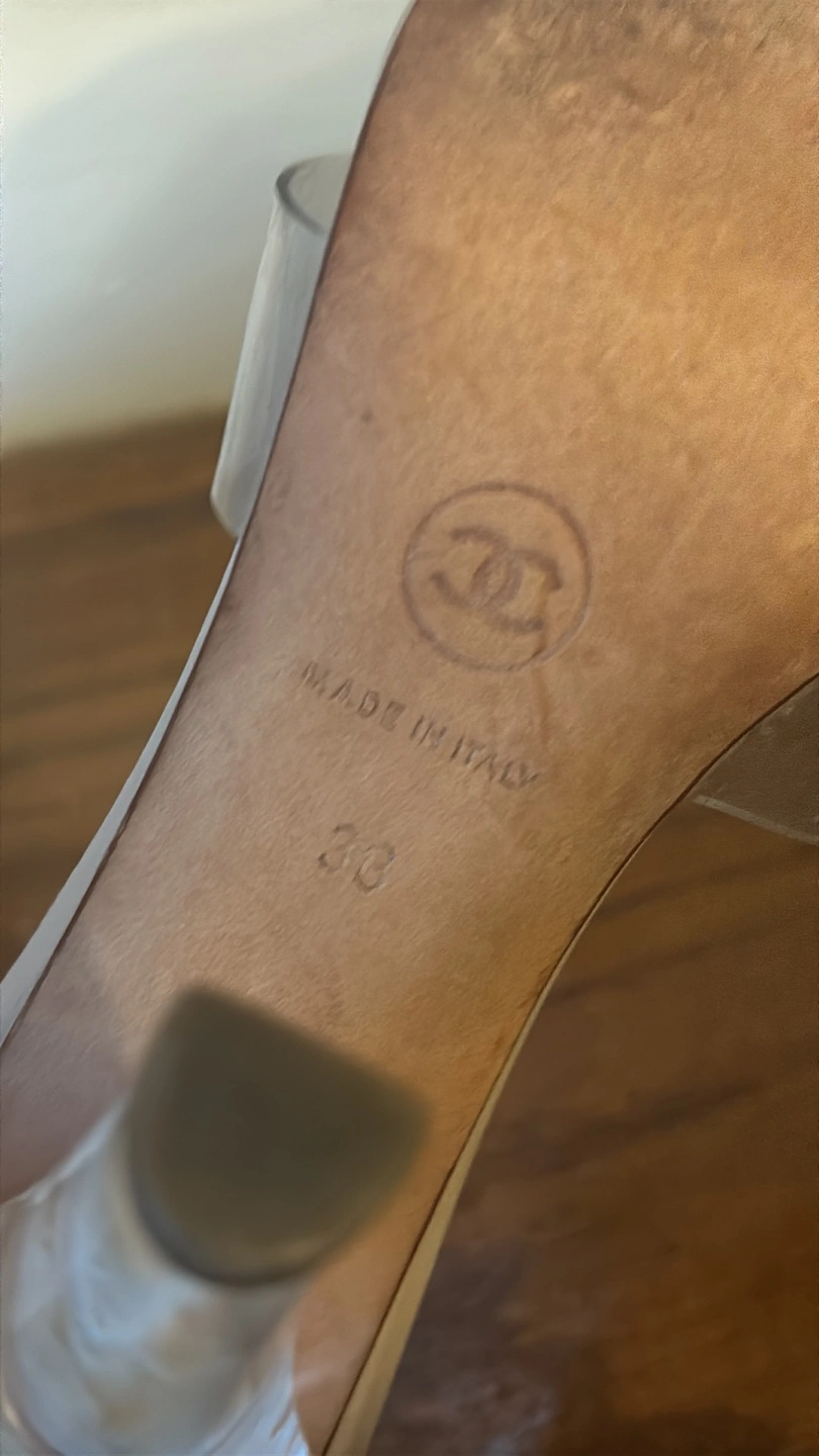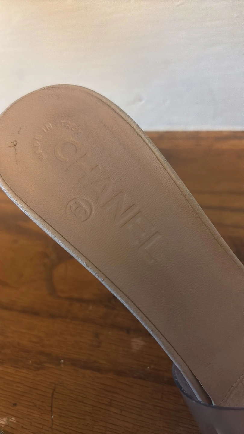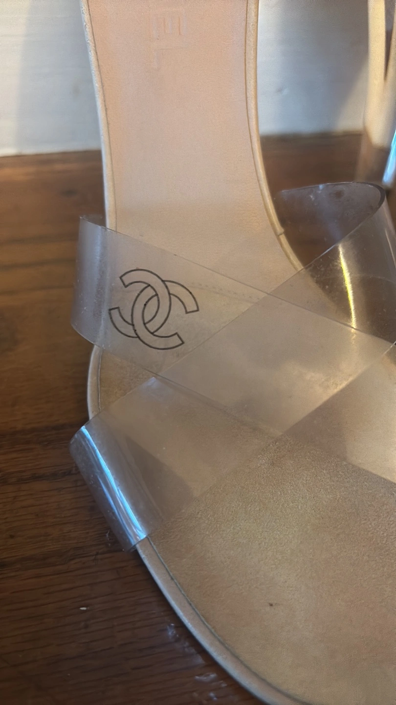 Elevate your wardrobe with these chic and timeless Chanel mule sandals. Designed with clear PVC crisscross straps featuring the iconic embossed CC logo, these sandals balance modern minimalism with classic luxury. The lucite block heel adds a sleek, contemporary edge, while the leather insole ensures comfort. From the resort 2009 season designed by Karl Lagerfeld • Brand: Chanel • Size: 38 (Note these run small and are narrow like most European shoes. Best fits a size 7.5 Serial Number: 09C G25934X01618 • Color: Nude insole with clear PVC straps • Heel: Approx. 3.5” lucite block heel • Details: Embossed CC logo on strap, cushioned leather insole • Condition: Pre-loved. Signs of wear on insole and sole (see photos). Straps and heels remain in great condition. These sandals are a rare find—perfect for pairing with dresses, denim, or evening looks. A versatile statement piece for any Chanel lover. ✨ Comes from a smoke-free, pet-free home