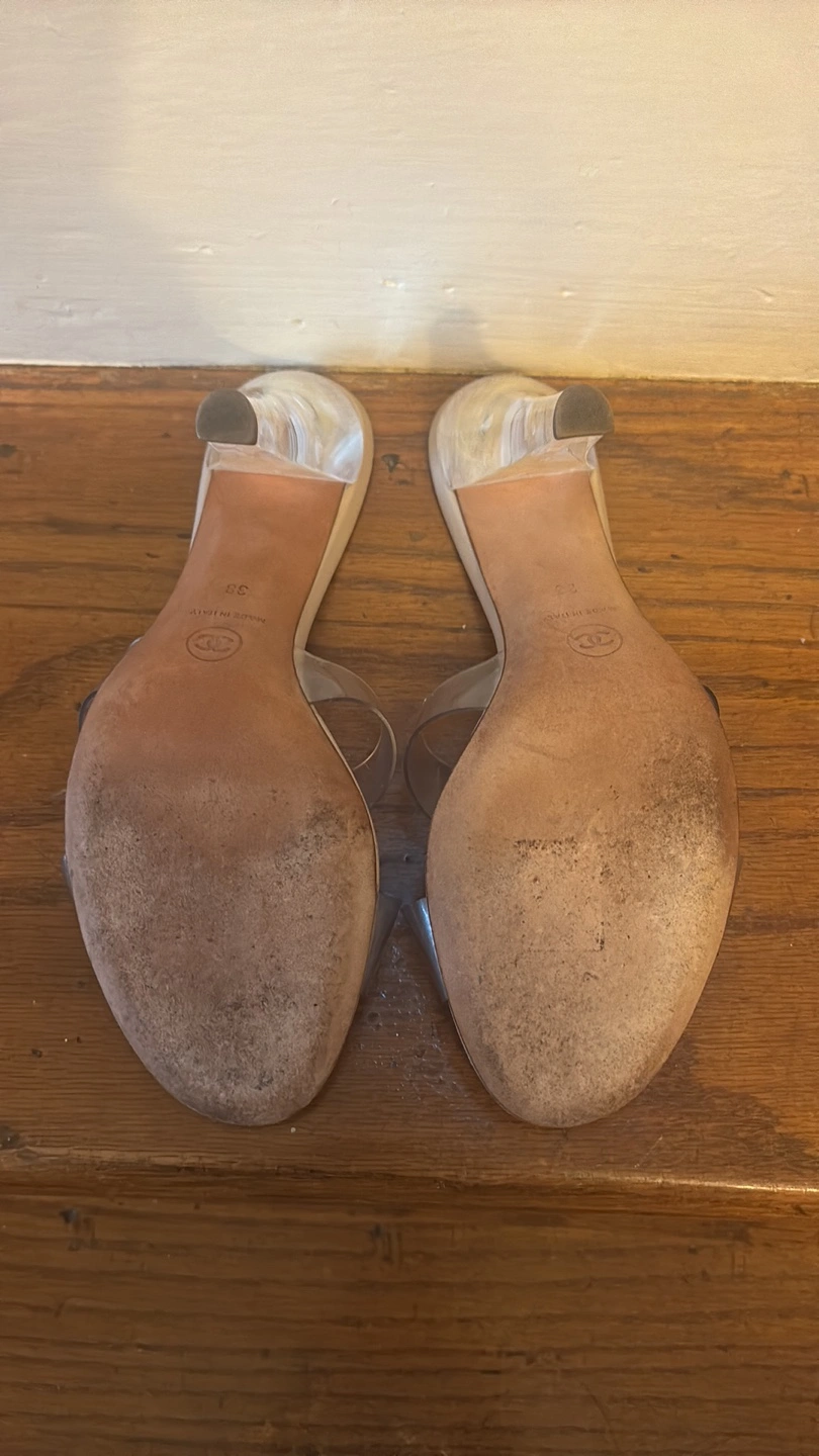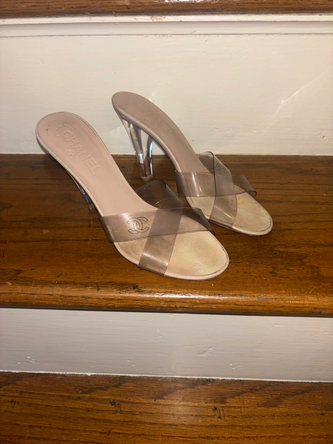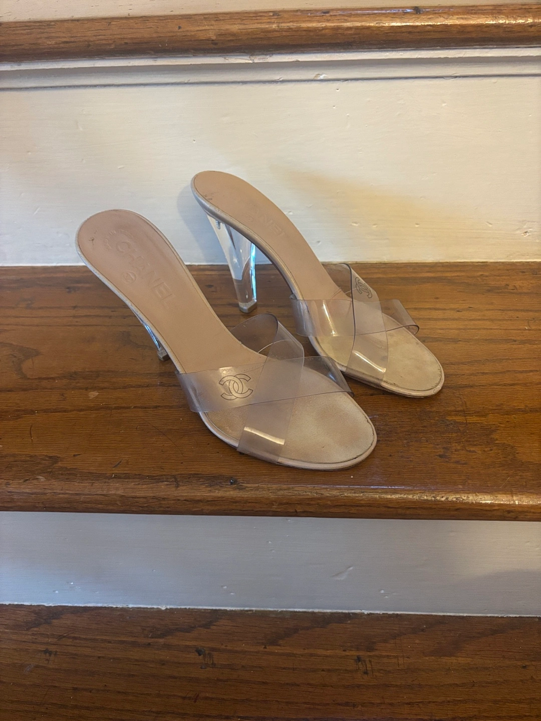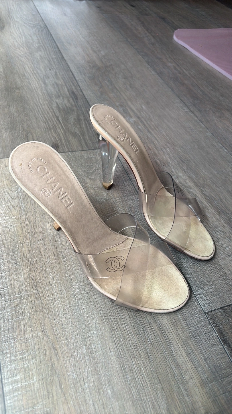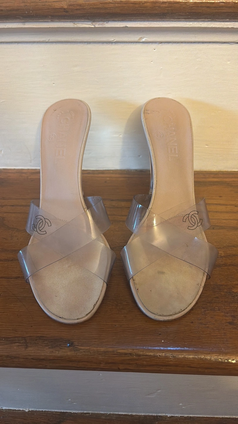 Elevate your wardrobe with these chic and timeless Chanel mule sandals. Designed with clear PVC crisscross straps featuring the iconic embossed CC logo, these sandals balance modern minimalism with classic luxury. The lucite block heel adds a sleek, contemporary edge, while the leather insole ensures comfort. From the resort 2009 season designed by Karl Lagerfeld • Brand: Chanel • Size: 38 (Note these run small and are narrow like most European shoes. Best fits a size 7.5 Serial Number: 09C G25934X01618 • Color: Nude insole with clear PVC straps • Heel: Approx. 3.5” lucite block heel • Details: Embossed CC logo on strap, cushioned leather insole • Condition: Pre-loved. Signs of wear on insole and sole (see photos). Straps and heels remain in great condition. These sandals are a rare find—perfect for pairing with dresses, denim, or evening looks. A versatile statement piece for any Chanel lover. ✨ Comes from a smoke-free, pet-free home
