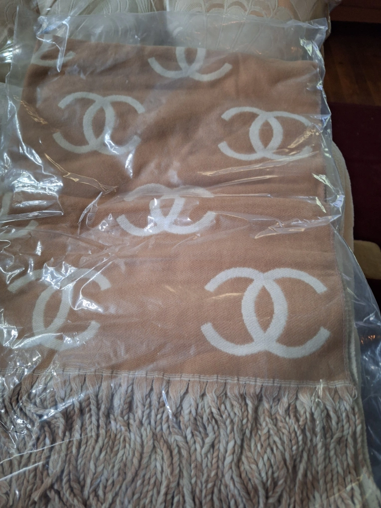15Selling a Chanel Inspired carf with the classic interlocking CC logo. The scarf is a light tan color and has fringe at the ends.