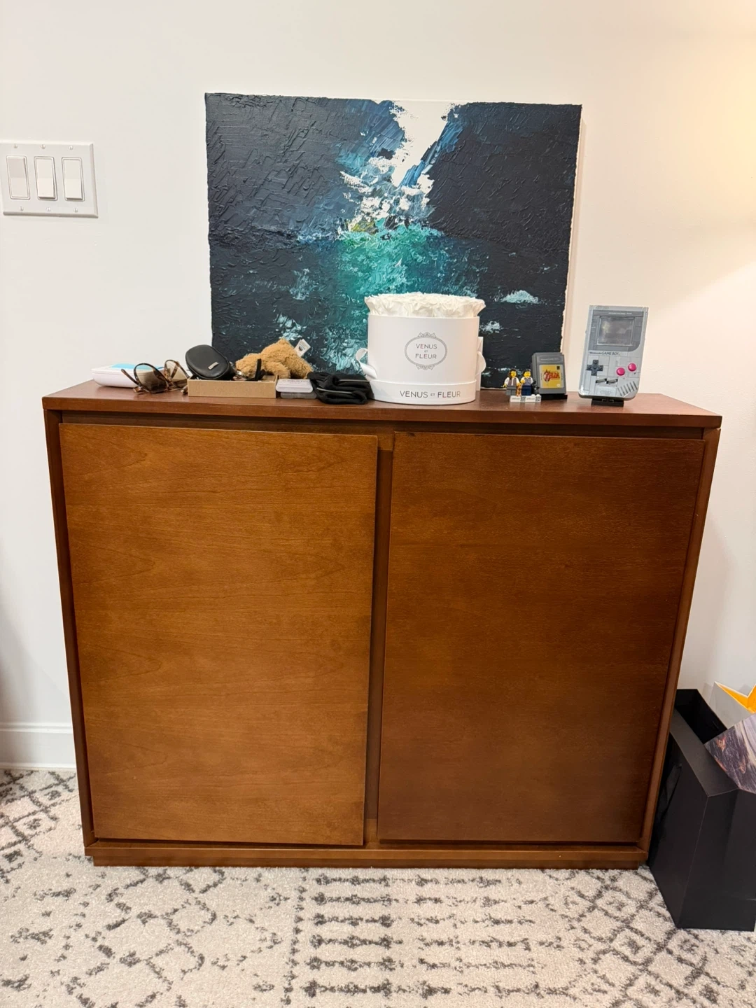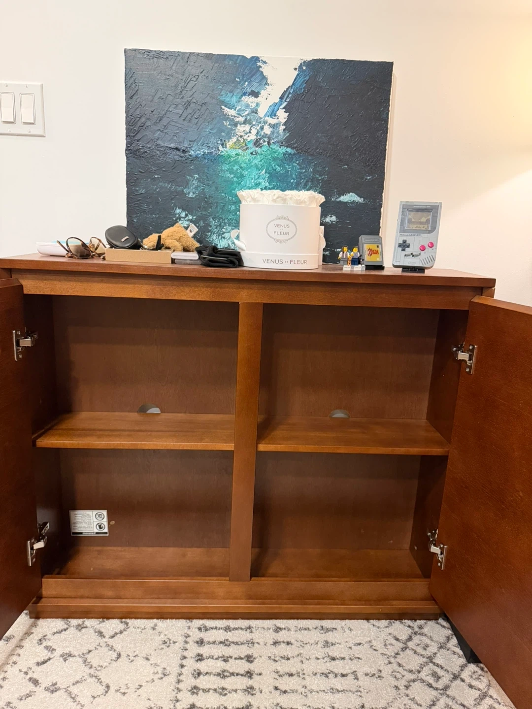 This is a nice walnut wooden media console with two shelves inside. It's perfect for storing electronics or other items. The cabinet doors keep everything tidy and out of sight!