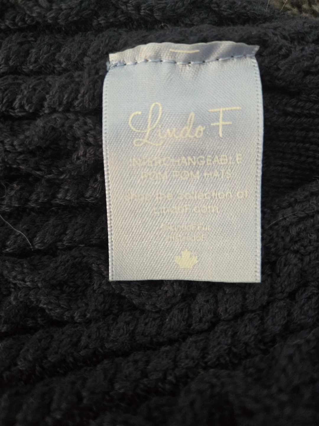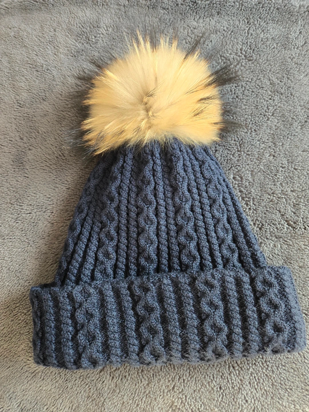 Cozy blue cable knit beanie with a removable fur pom pom. This hat is from Lindo F and is designed for warmth. One size fits most. This is a great winter hat. Pick up at Gerrard and Greenwood.