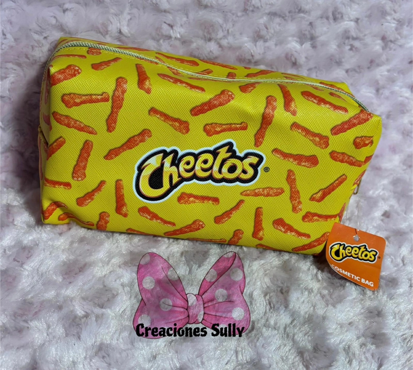 Cheetos cosmetic bag. It's a fun and unique way to store your makeup or other small items! The bag is yellow with Cheetos scattered all over it