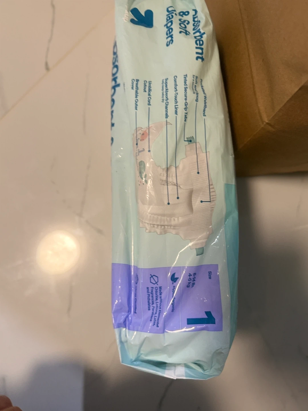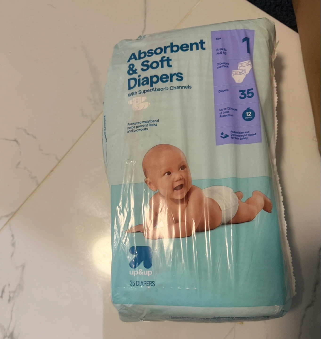 Absorbent & Soft Diapers in size 1. Features a "rocketed waistband" for leak protection and "SuperAbsorb Channels." Provides up to 12 hours of protection. These diapers are pediatrician and dermatologist tested. For babies weighing 9-14 lbs (4-6.4 kg).
