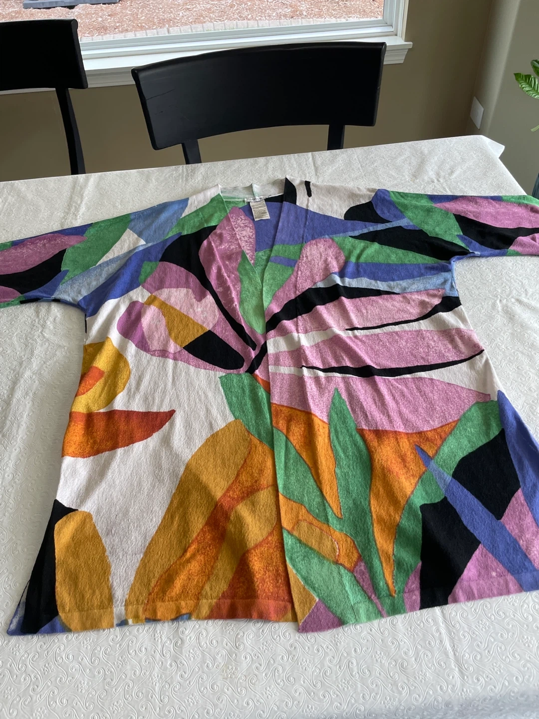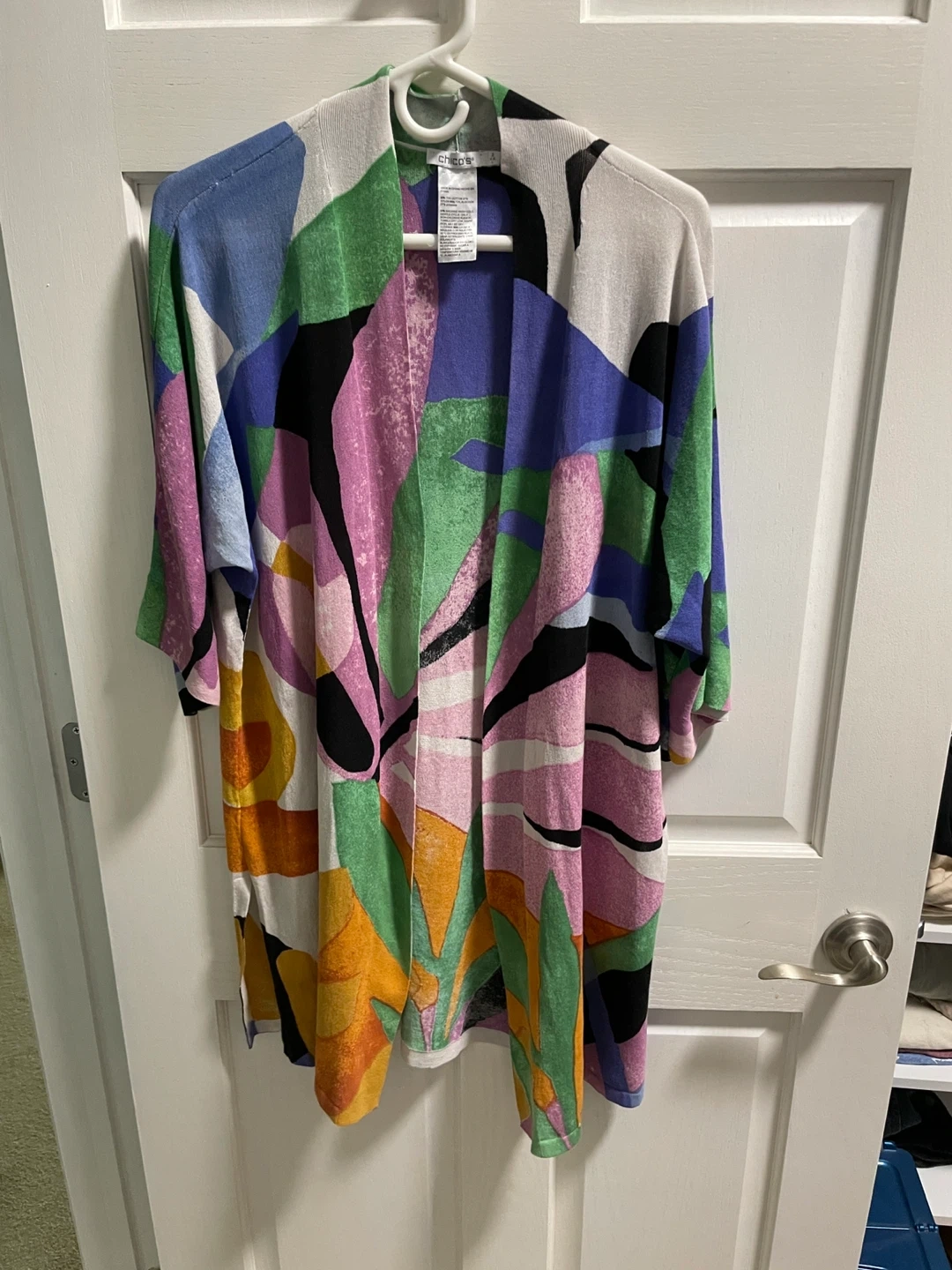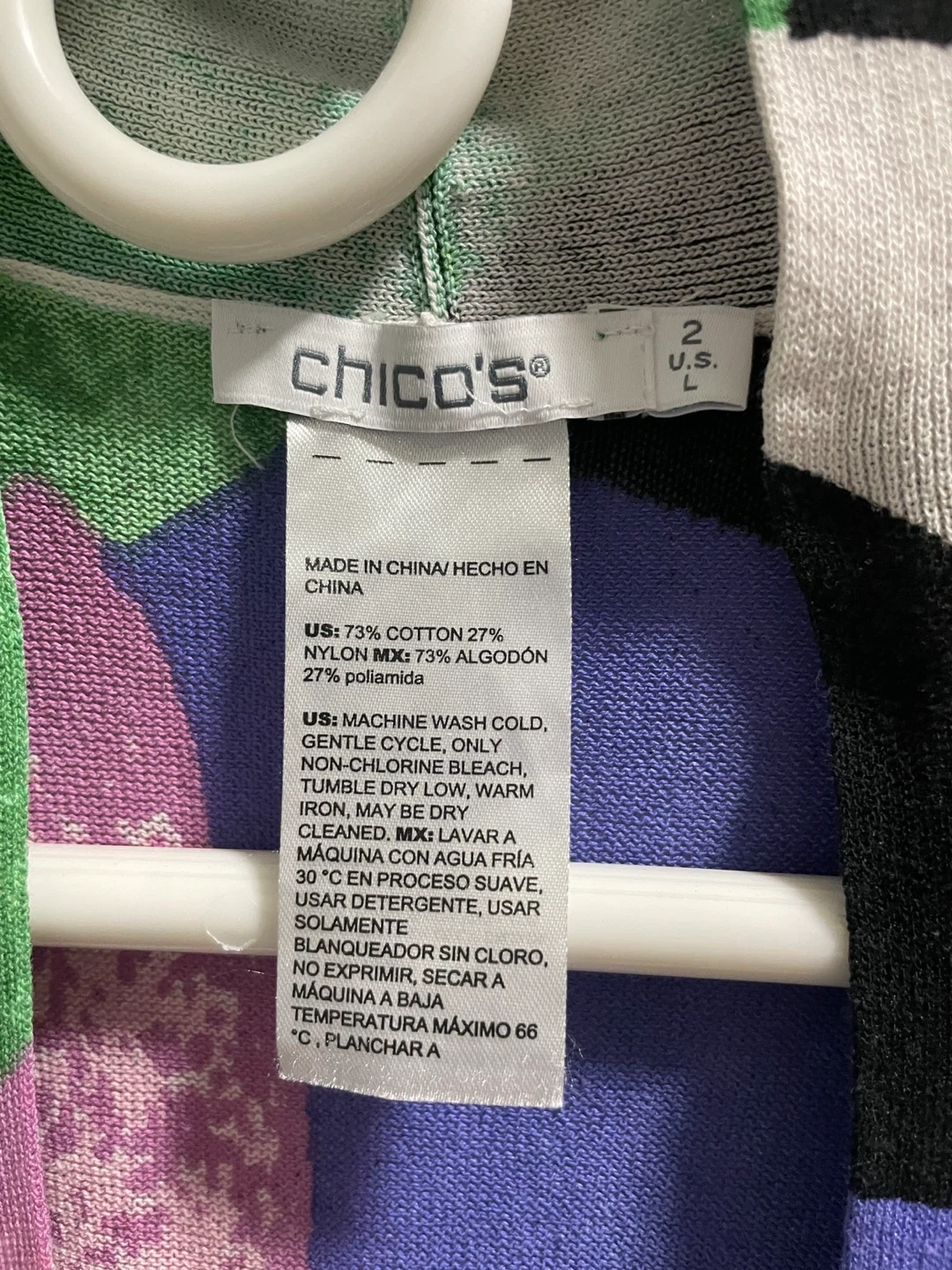 65This is a Chico's kimono in size 2. Chico’s size 2 is comparable to size 12 according to their chart. It features a vibrant and colorful abstract design. The material is a blend of 73% cotton and 27% nylon, making it lightweight and comfortable. It's in great condition and ready to add a pop of color to your wardrobe! Looks great over black travelers separates!