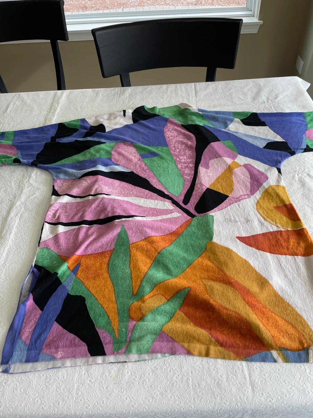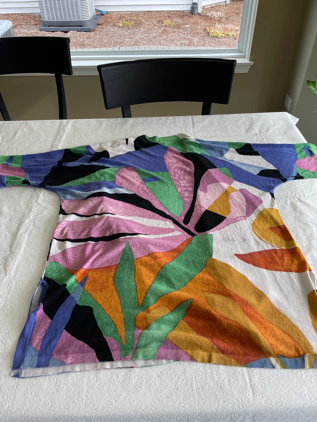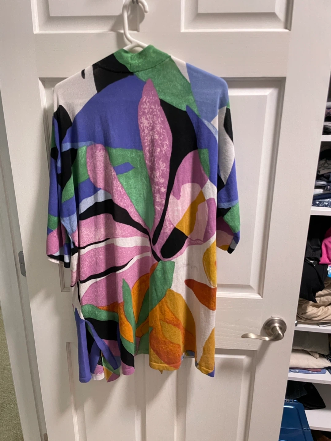 65This is a Chico's kimono in size 2. Chico’s size 2 is comparable to size 12 according to their chart. It features a vibrant and colorful abstract design. The material is a blend of 73% cotton and 27% nylon, making it lightweight and comfortable. It's in great condition and ready to add a pop of color to your wardrobe! Looks great over black travelers separates!