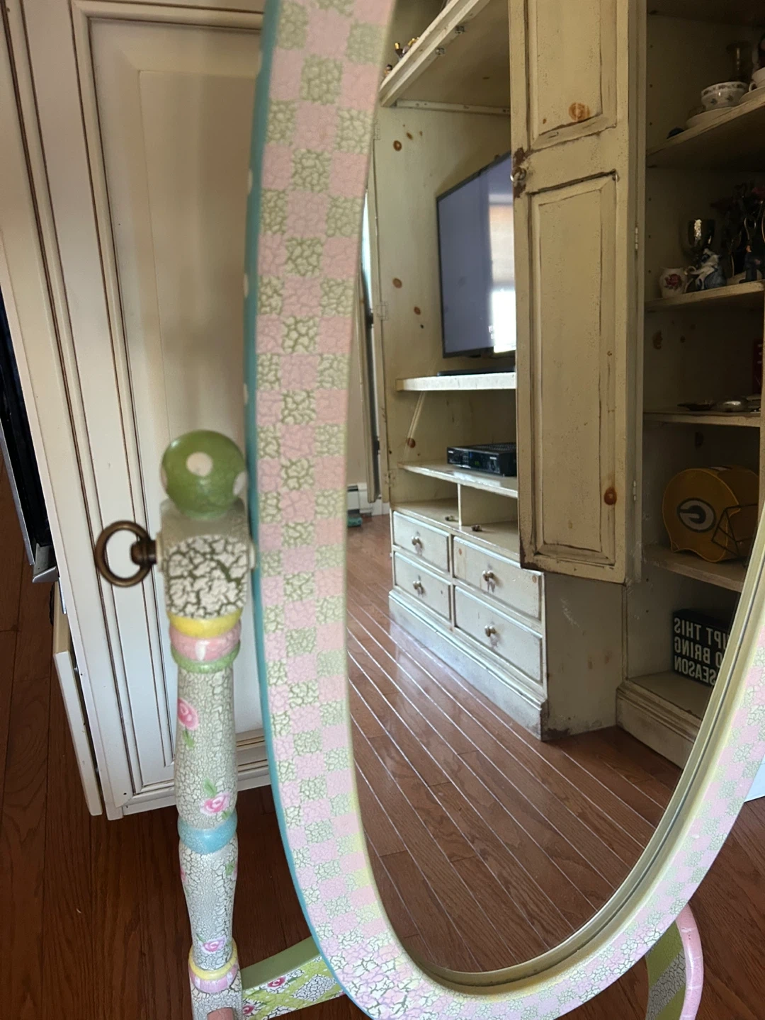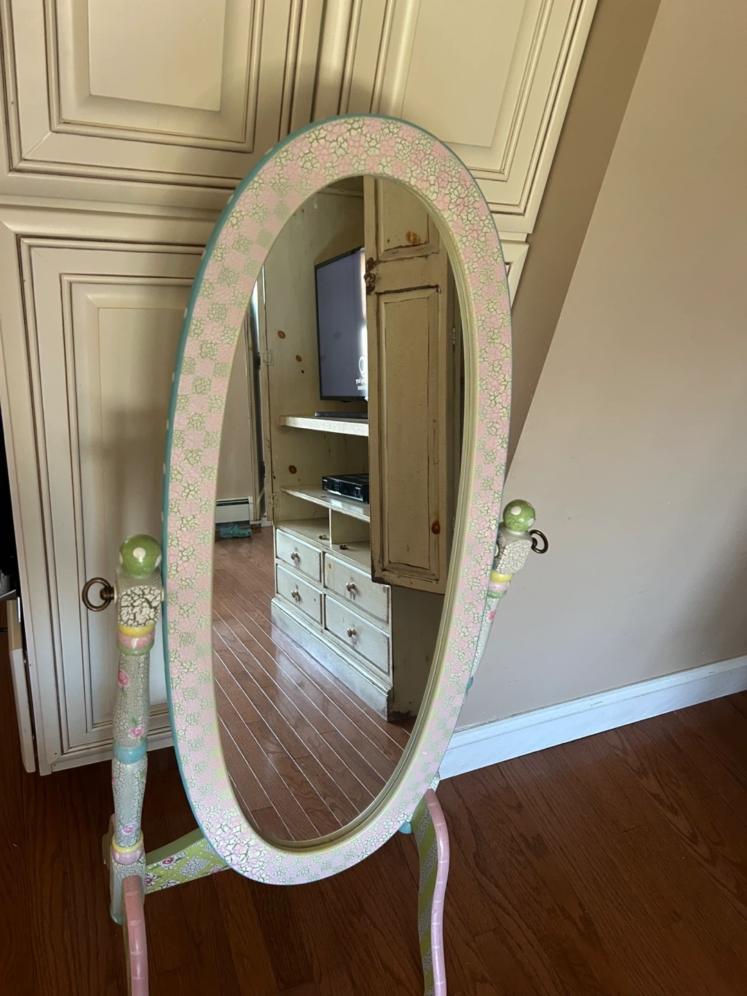 Here is a standing oval mirror with a unique and decorative frame. It features a light-colored frame with a pink and green floral pattern. The mirror is in good condition and ready to add a touch of charm to any child room