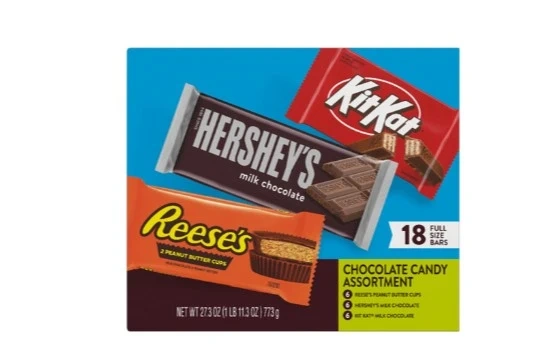 10Selling a chocolate candy assortment that includes: - Reese's Peanut Butter Cups - Hershey's Milk Chocolate - KitKat Milk Chocolate 18ct candy bars Net weight is 27.3 oz (1 lb 11.3 oz) 773g. The box contains 18 full-size bars