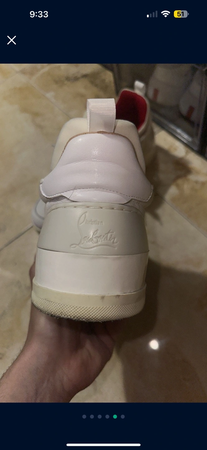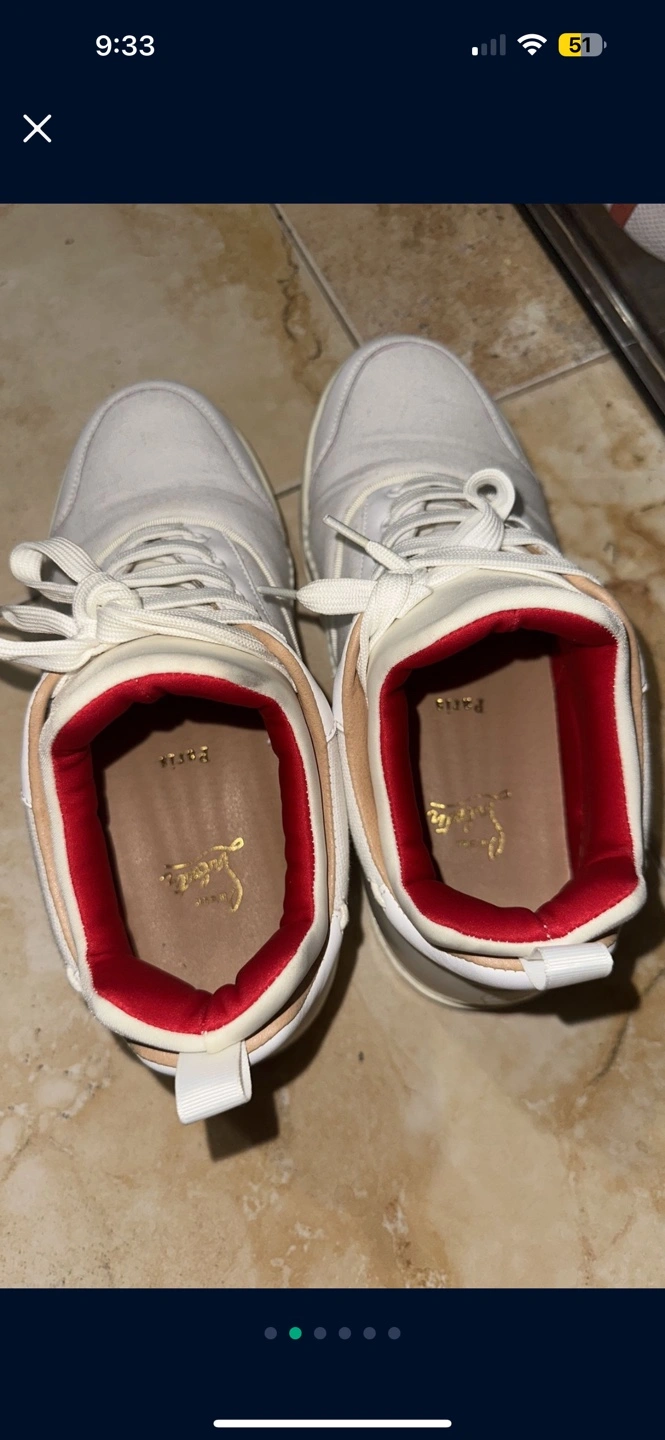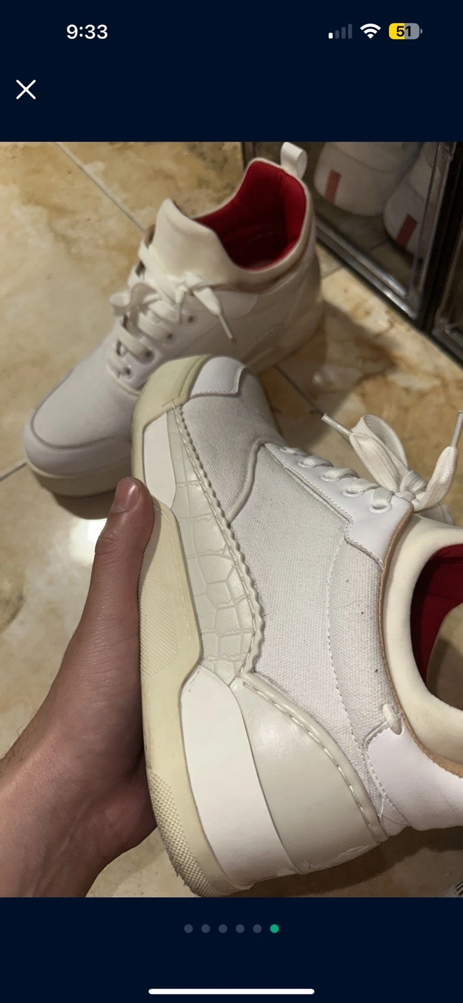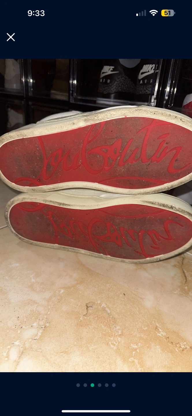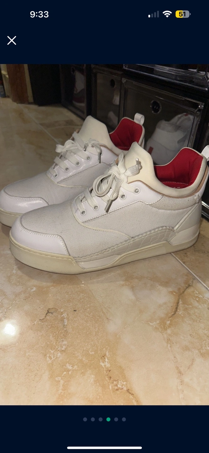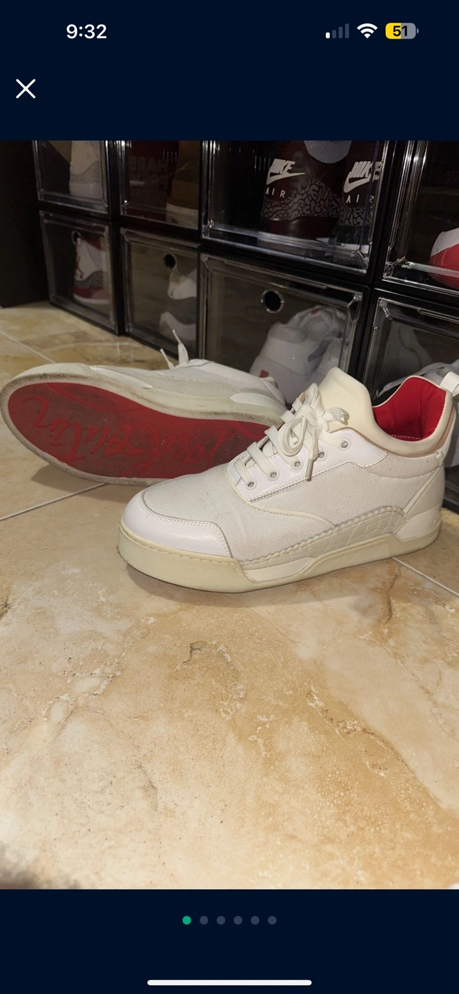 70Men's white leather and canvas sneakers. Red signature Louboutin soles. Low-top style. Lace-up closure. Pre-owned.