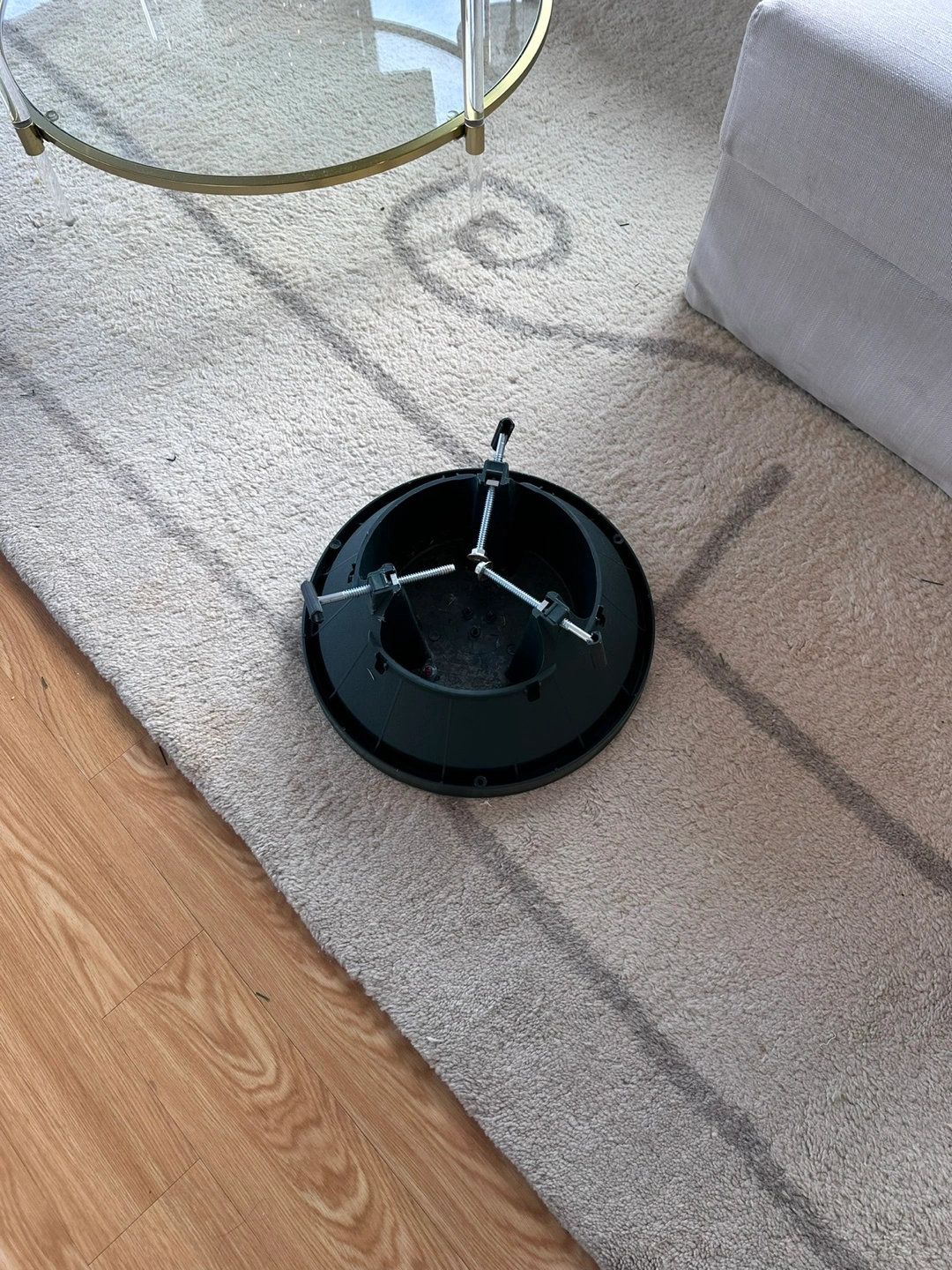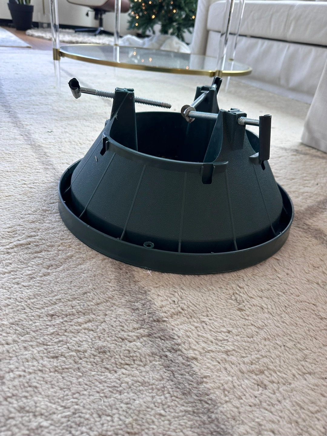 Black plastic Christmas tree stand. Three metal arms and screws to secure tree.