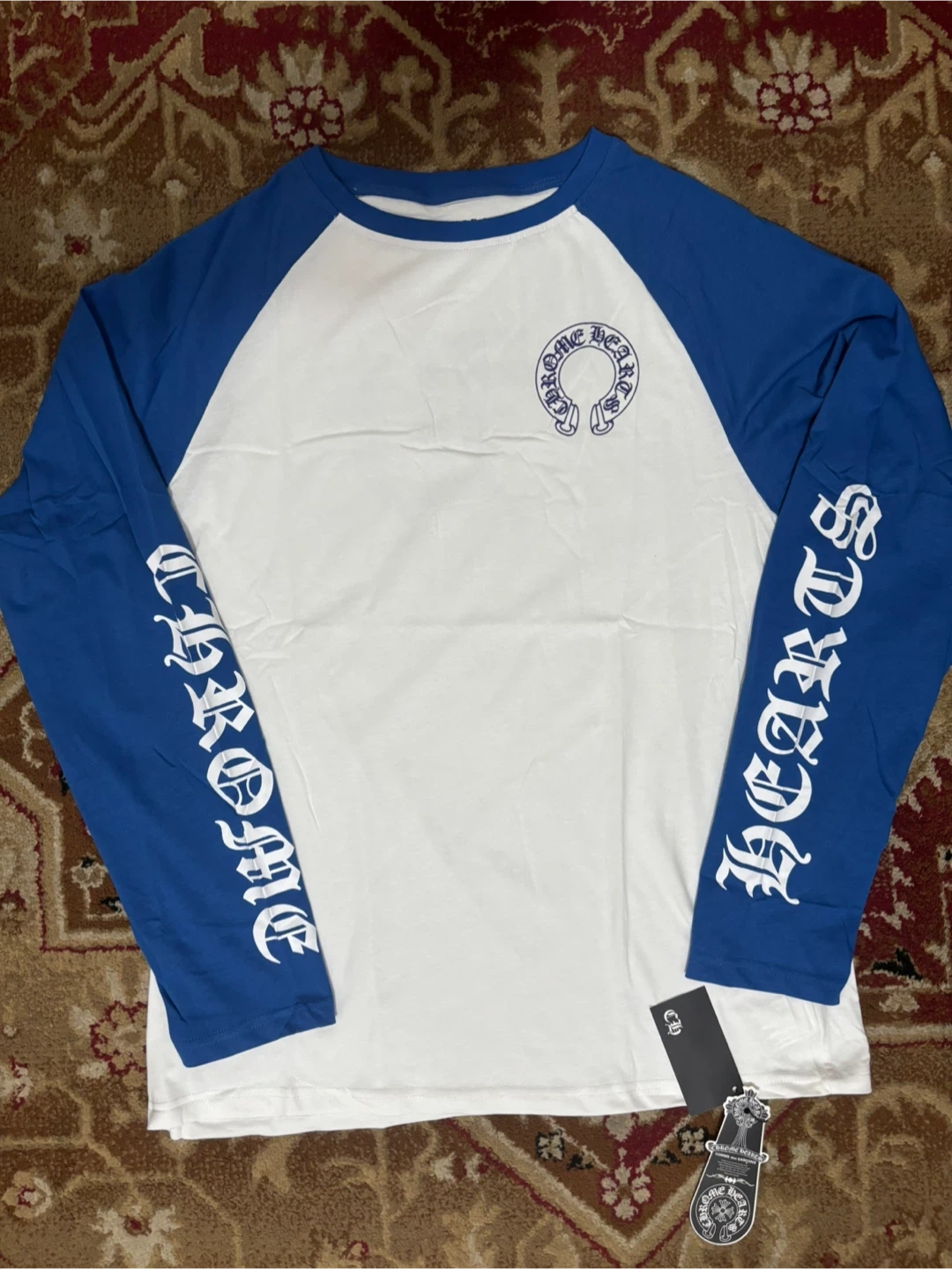 20Chrome Hearts x Comme des Garcons long sleeve tee in size M. The shirt features a white body with blue raglan sleeves and Chrome Hearts text down the sleeves. It's in great condition and ready for a new home!