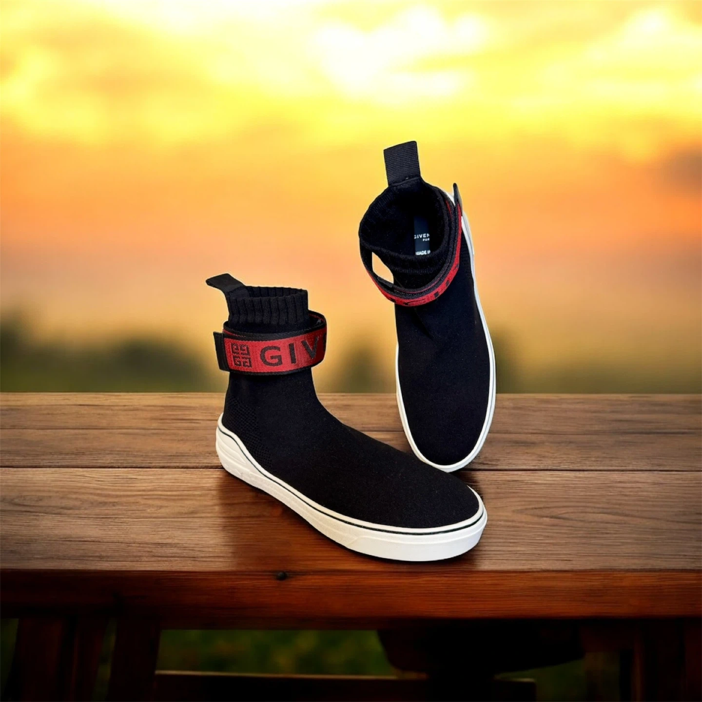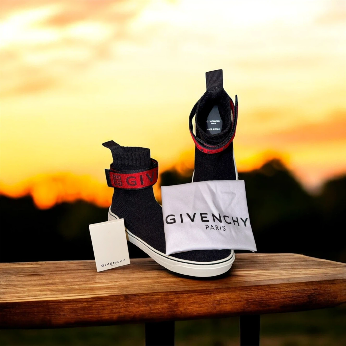 Authentic Givenchy black sock sneakers with red accent band. Made in Italy. Shoes are designed with a sock-like fit and feature a rubber sole.