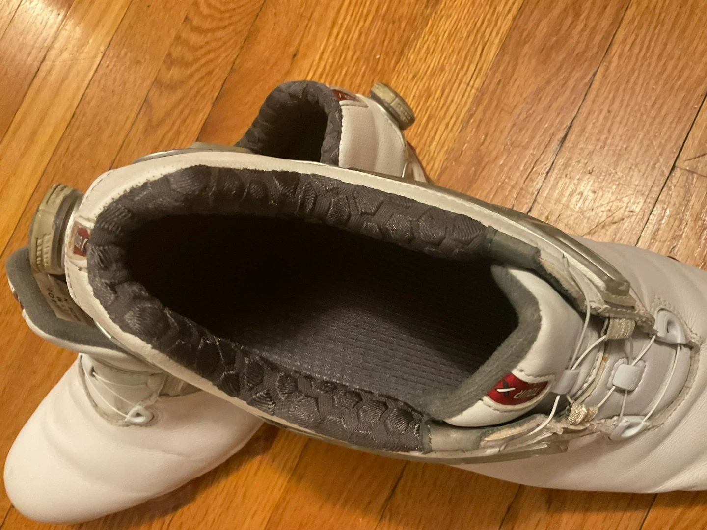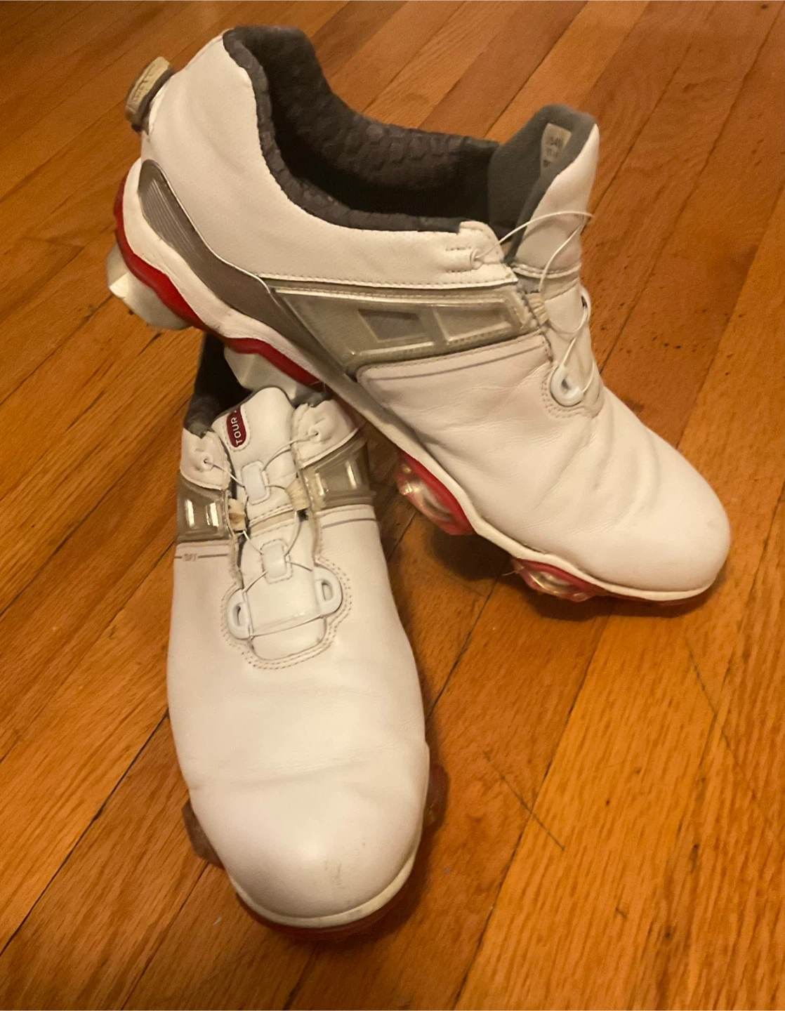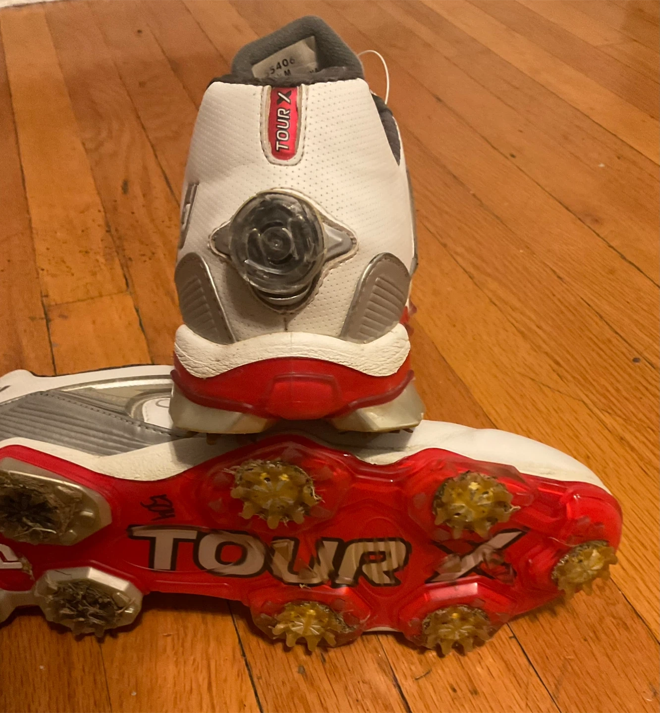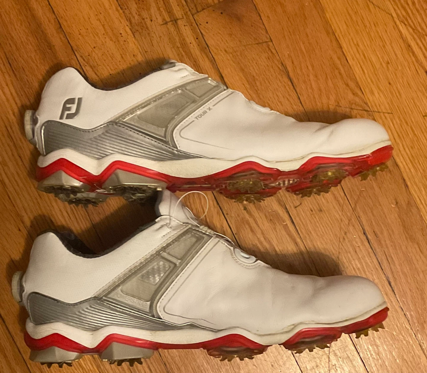 White FootJoy Tour X golf shoes. Features a BOA closure system for a custom fit. Spiked soles provide excellent traction on the course.