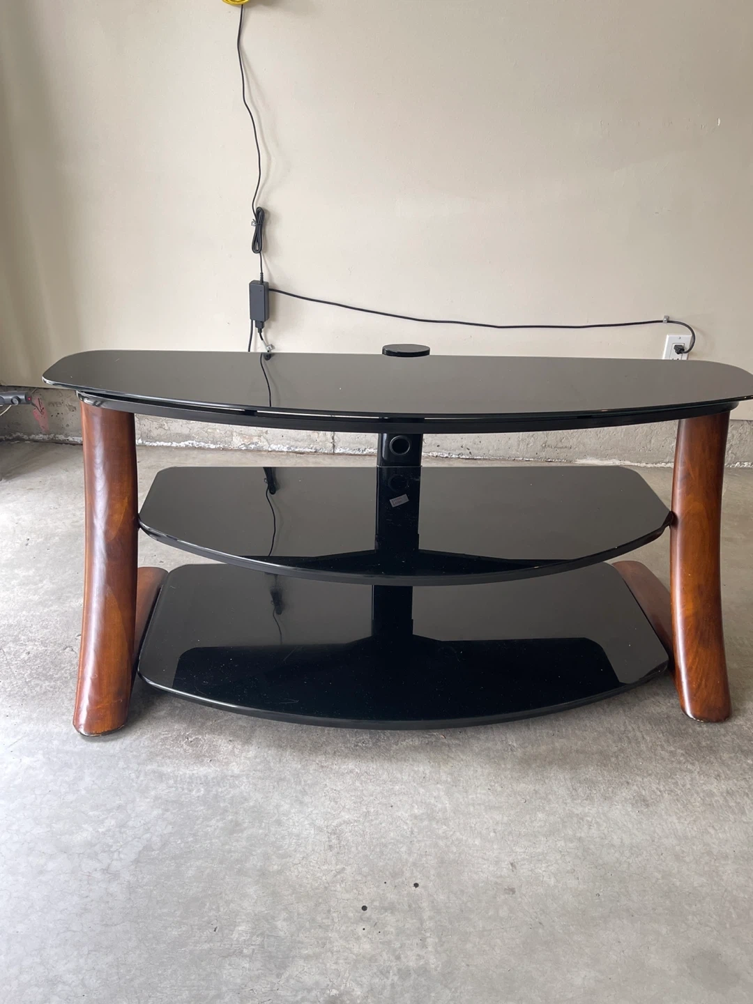 This TV stand features three black glass shelves for your media components. It has elegant wooden accents on the sides for a stylish look. Cable management is built in to keep cords tidy. Its curved design offers a modern aesthetic.