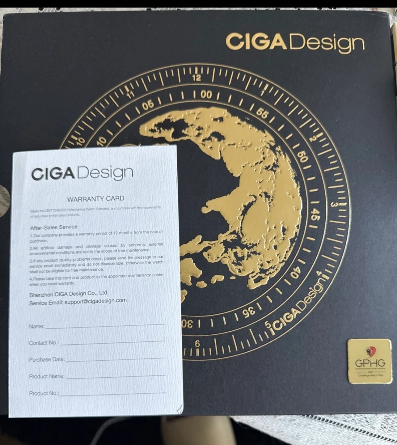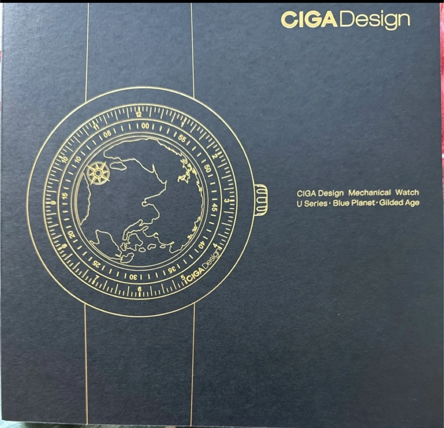 Selling a CIGA Design mechanical watch from the U Series, specifically the Blue Planet Gilded Age model. It comes with the original box and an extra strap. Also included is the instruction manual.