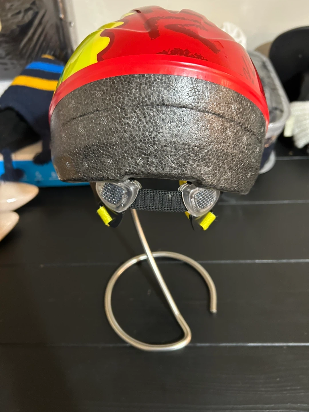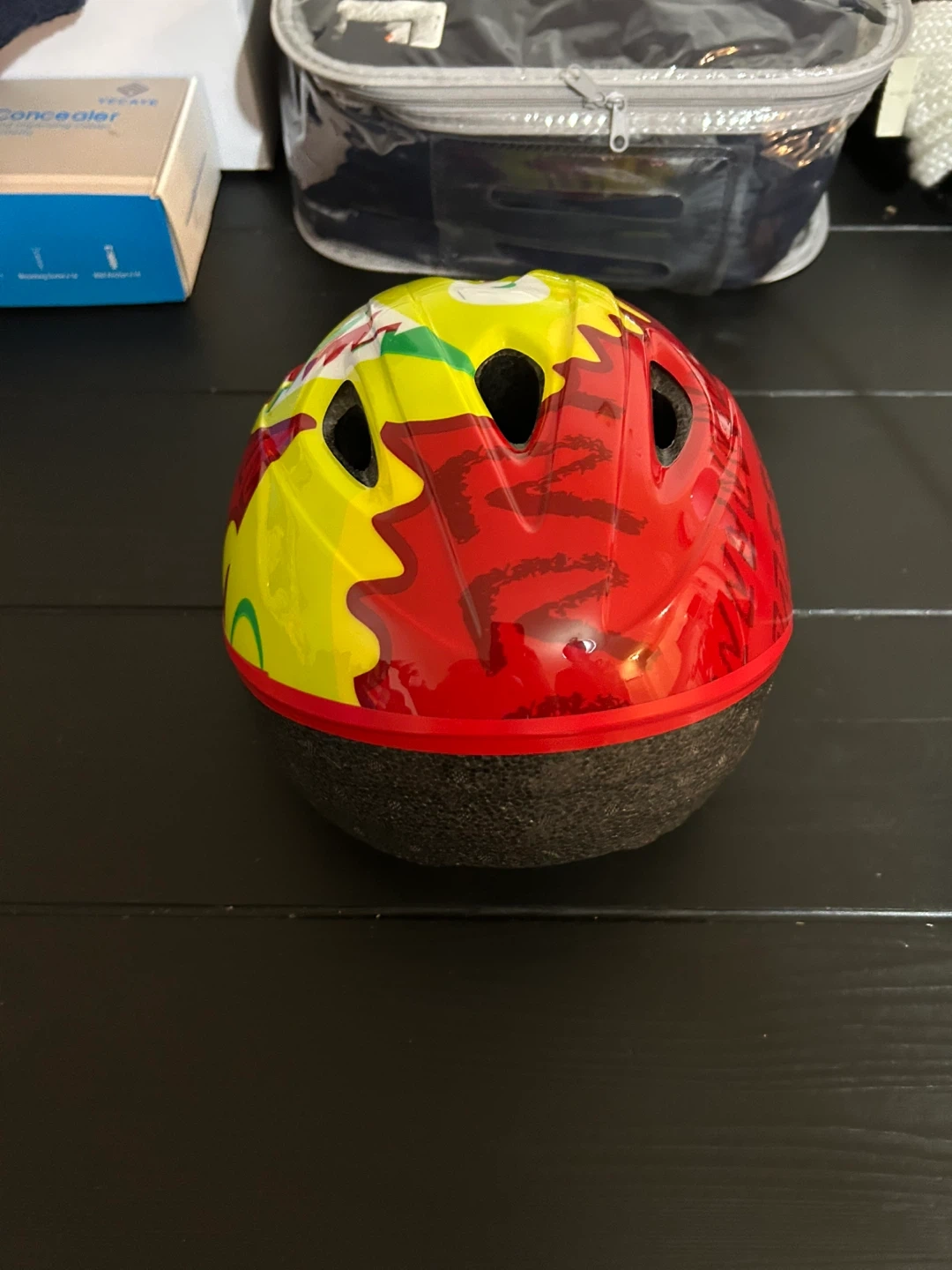 Kids' safety bike helmet with a fun red and yellow monster design. It's designed for infant riders. The helmet includes adjustable straps for a secure fit.