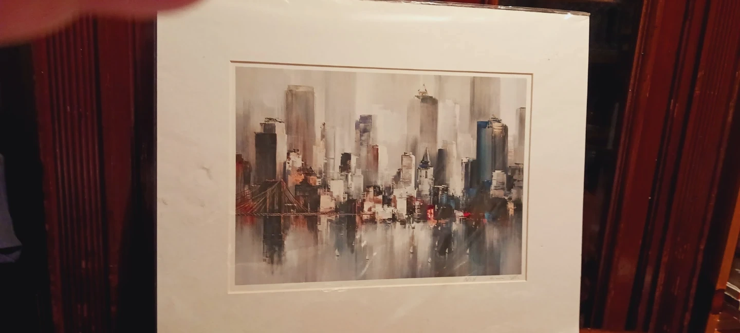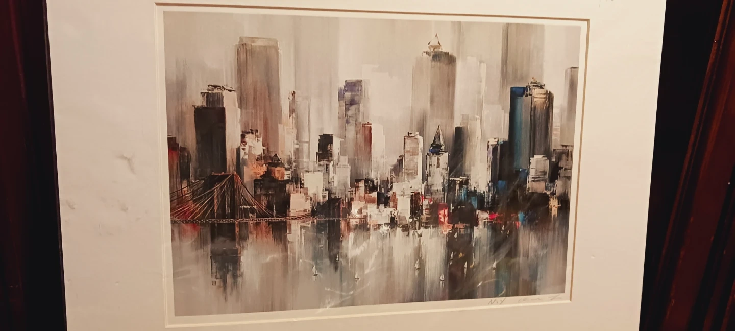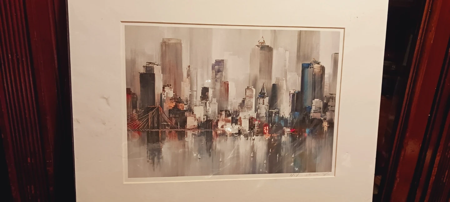 1000+CITY ABSTRACT WITH LIQUID ART FORM , depicting the NYC skyline signed art print. It is not framed. 20"×16". ALL MY PRICES ARE NEGOTIABLE !!