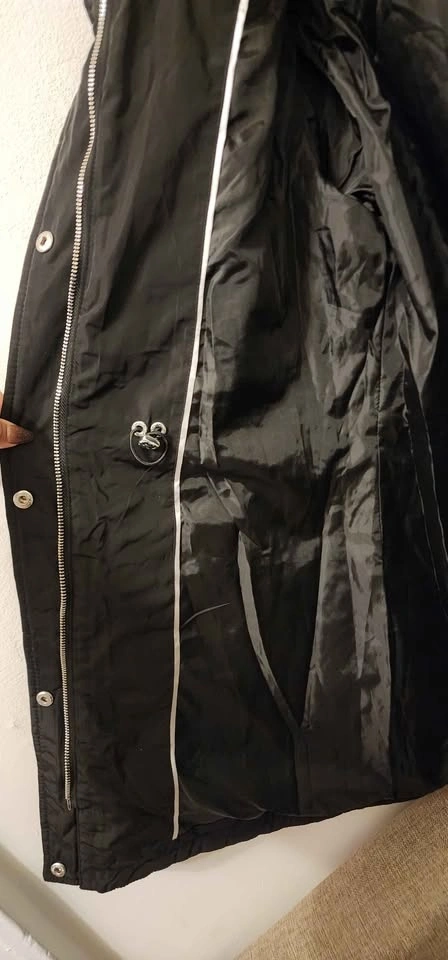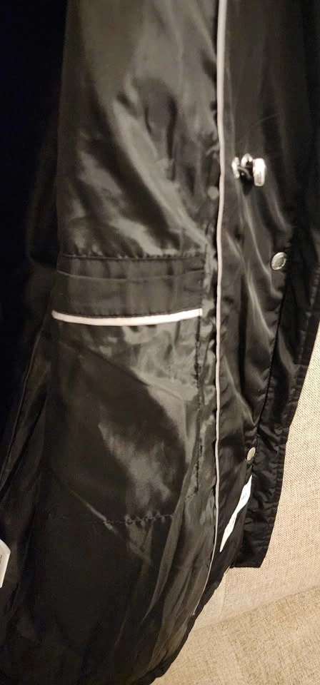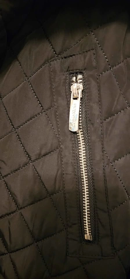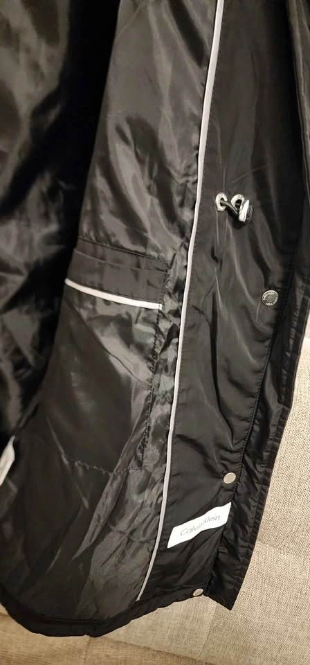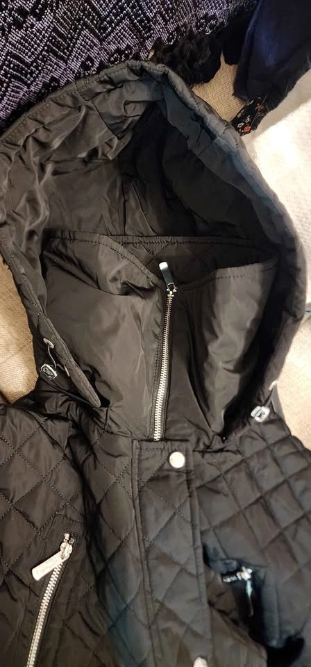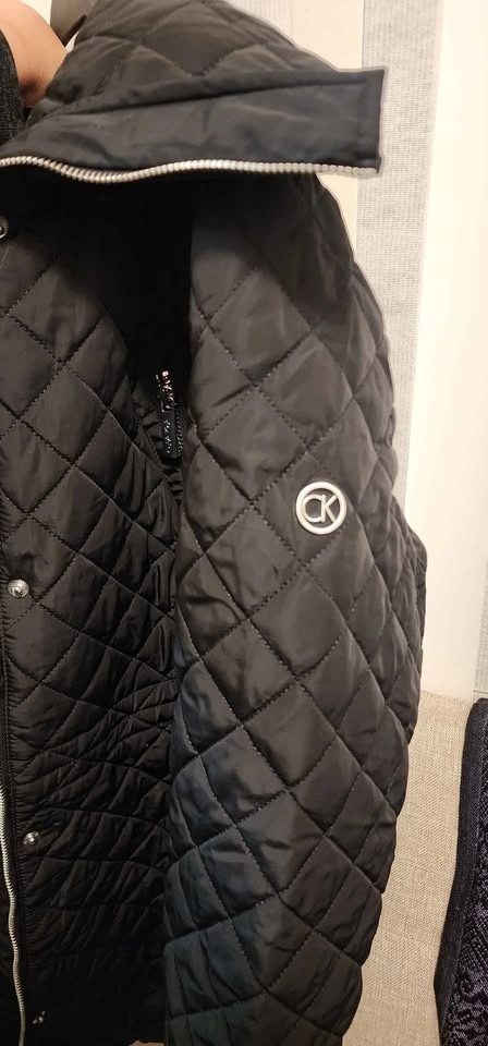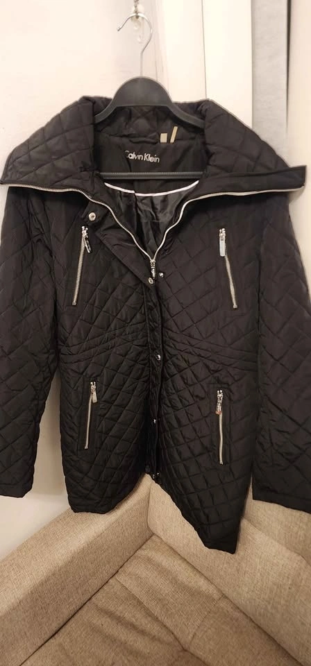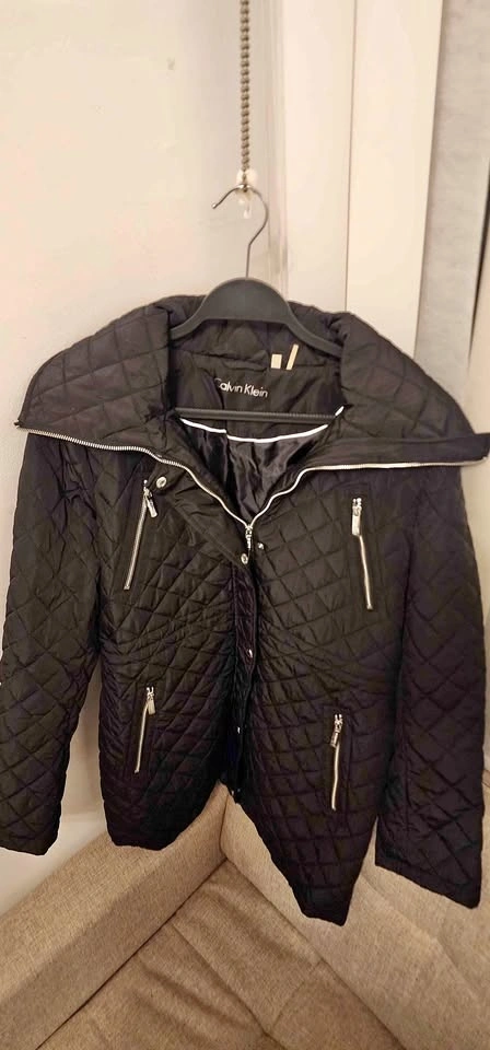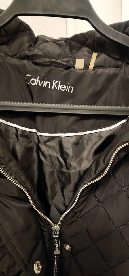 Calvin Klein black quilted puffer jacket with a high collar. Diamond quilting pattern. Full zipper closure with a snap storm placket. Multiple exterior zipper pockets. Water-resistant. Only used once, in excellent condition.