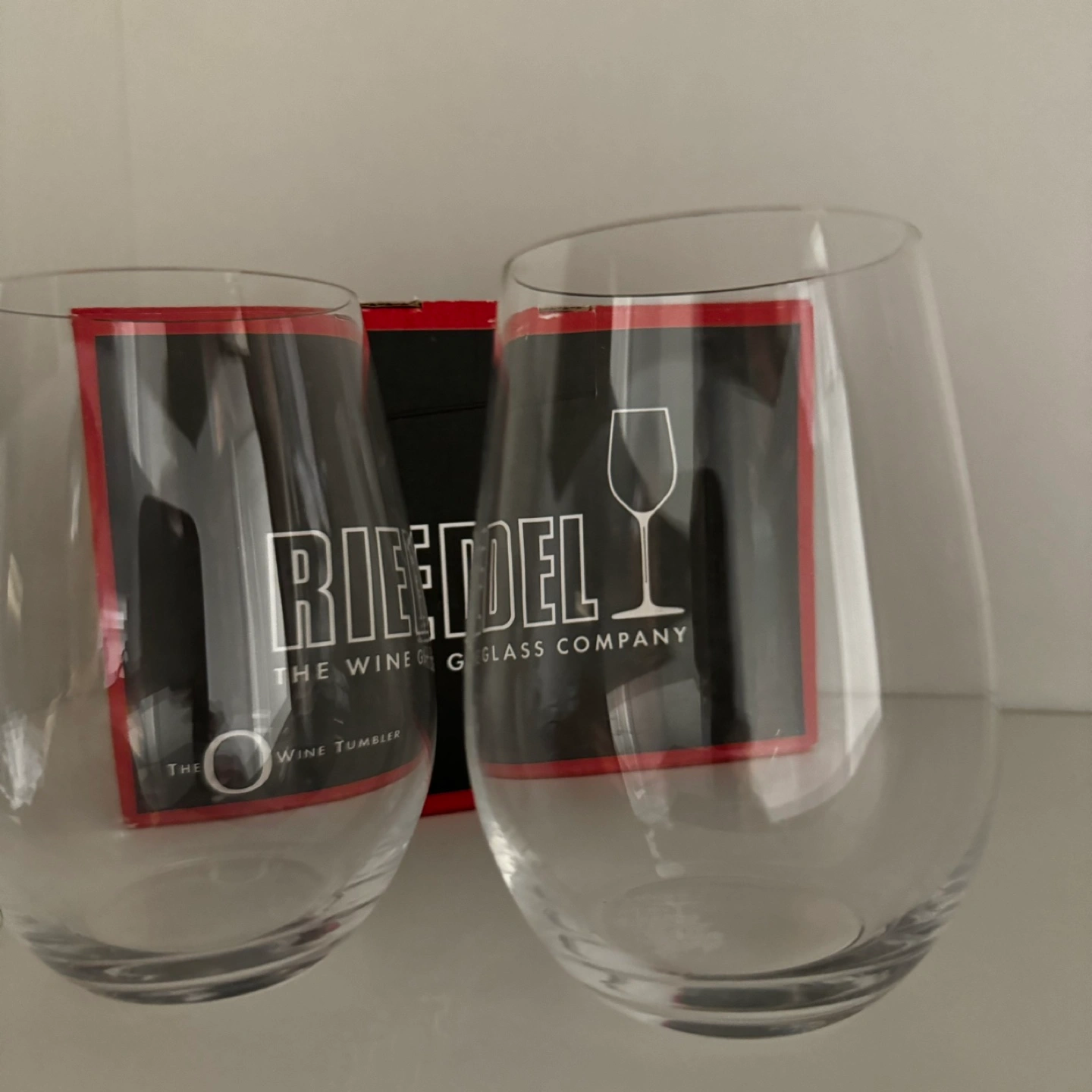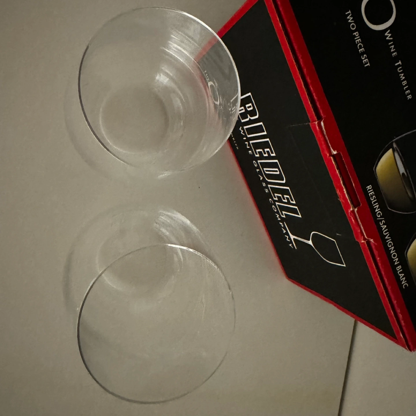 - Two-piece wine tumbler set. Clear glass. Pretty pGood condition. No scratches, box included.