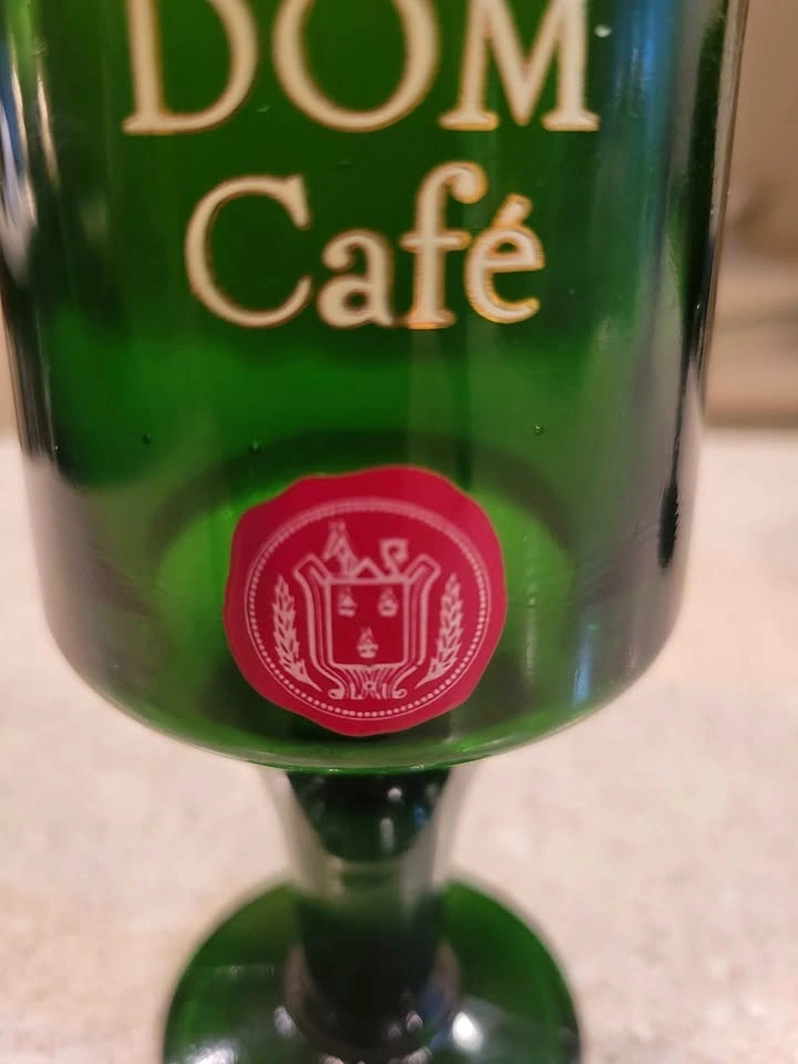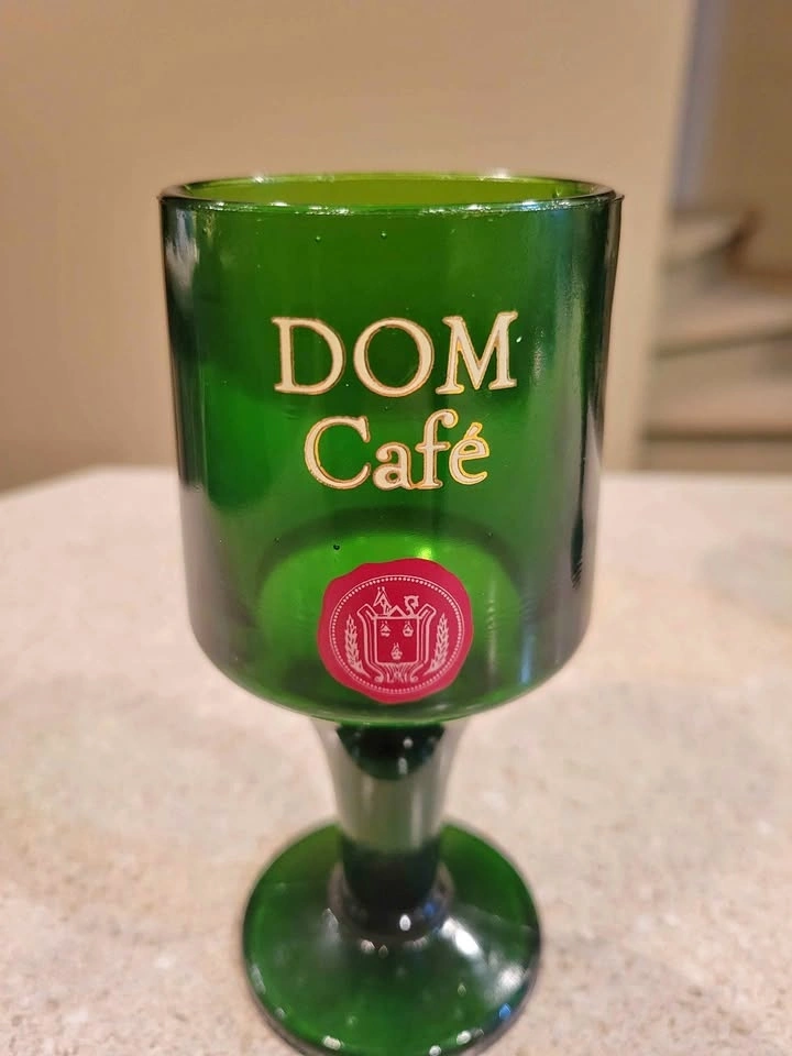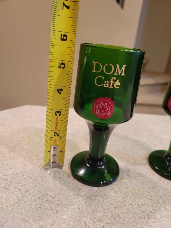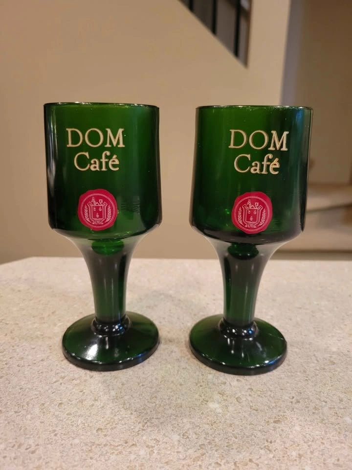 This is a pair of vintage emerald green DOM Café advertising liqueur glasses. The heavy, pressed-glass stemware dates from the 1970s. It is embossed in gold with the "DOM Café" script and a red seal logo. The glasses were produced to serve coffee with DOM Benedictine liqueur. They typically have a 5-ounce capacity and stand around 5.5 to 5.75 inches tall.
