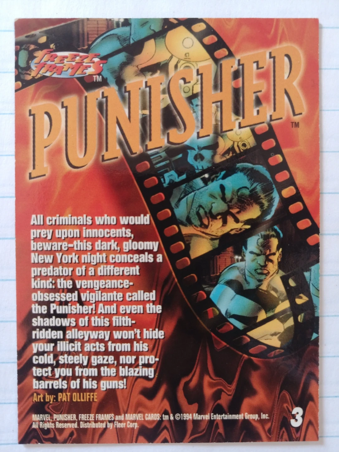 This is a Marvel Punisher trading card from the Freeze Frames series. Features artwork and a description of the character. Copyright 1994 Marvel Entertainment Group, Inc.