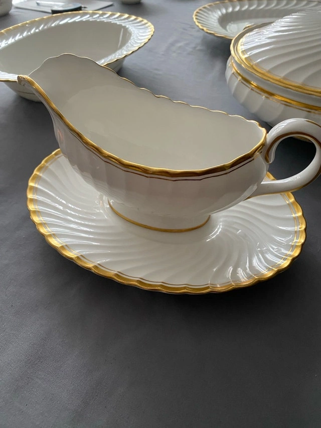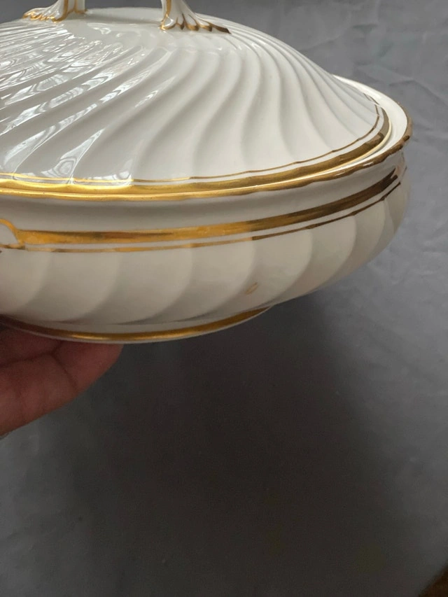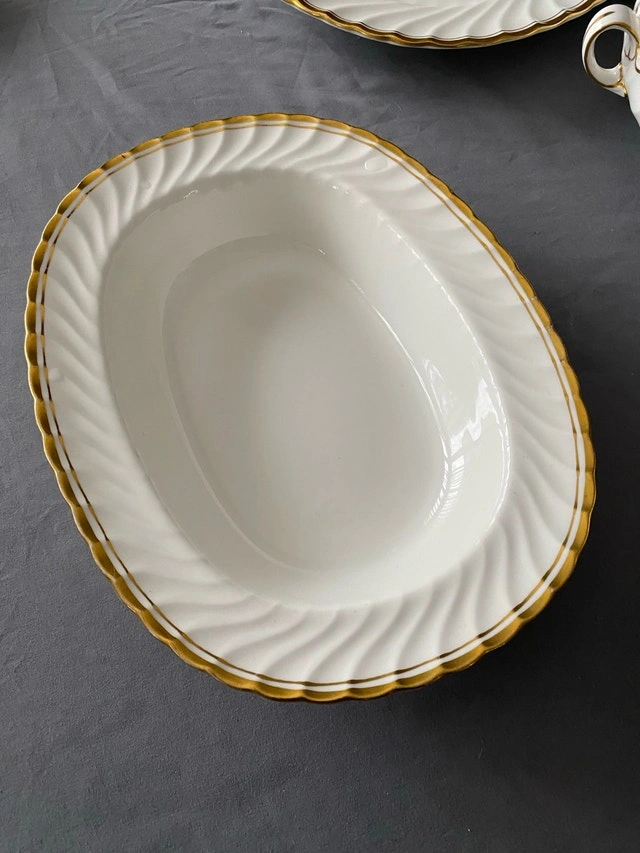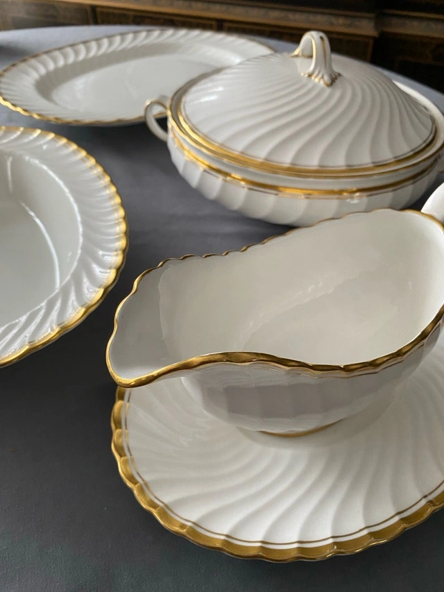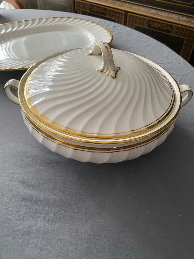 Individual prices: Covered serving bowl $60, Gravy boat with under dish $30, Large platter $40, Serving dish $30. Some age/wear on bottom of casserole bowl. Two superficial marks—one on casserole bowl side surface and one on serving dish gold edge (see last two photos). Otherwise, excellent condition. Perfect for elegant holiday dining.