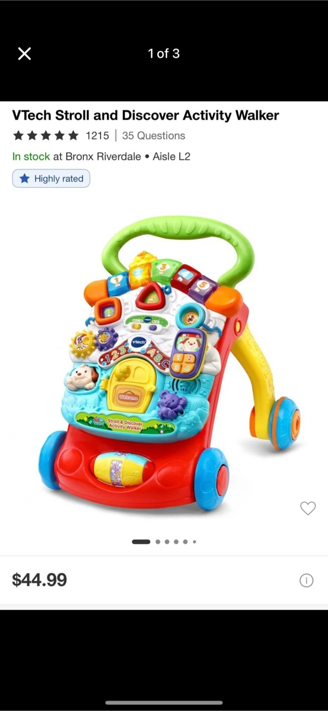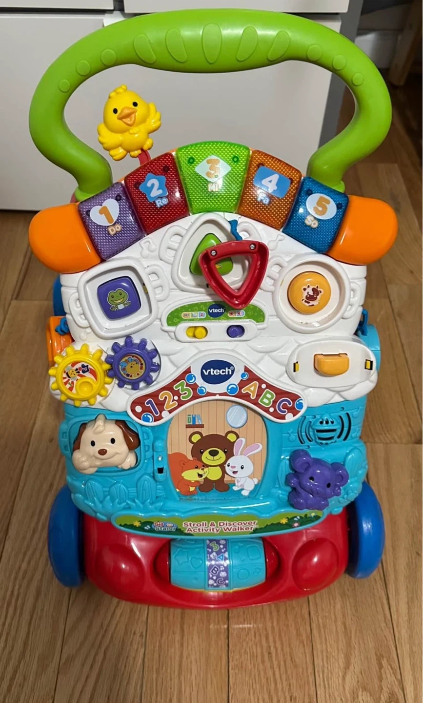 This VTech Stroll and Discover Activity Walker features interactive play stations. It includes a phone, piano keys, and bead abacus. Suitable for infants and toddlers learning to walk.