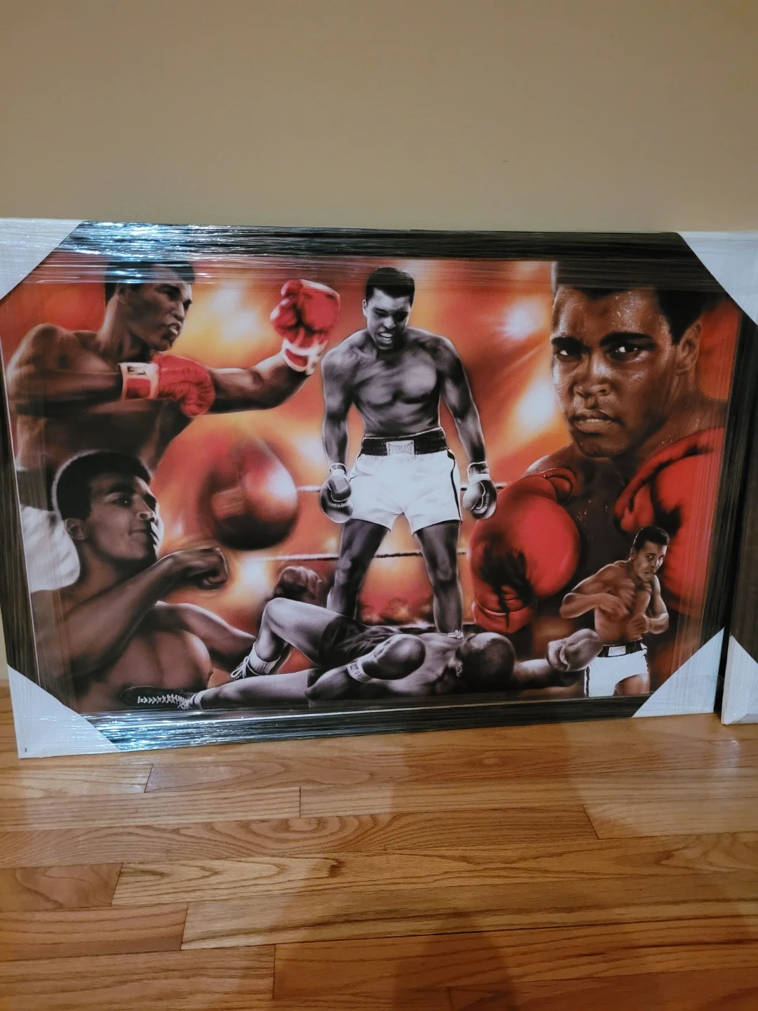 This framed collage features iconic images of Muhammad Ali in action. It's a great piece for boxing fans! The artwork is framed and ready to hang.