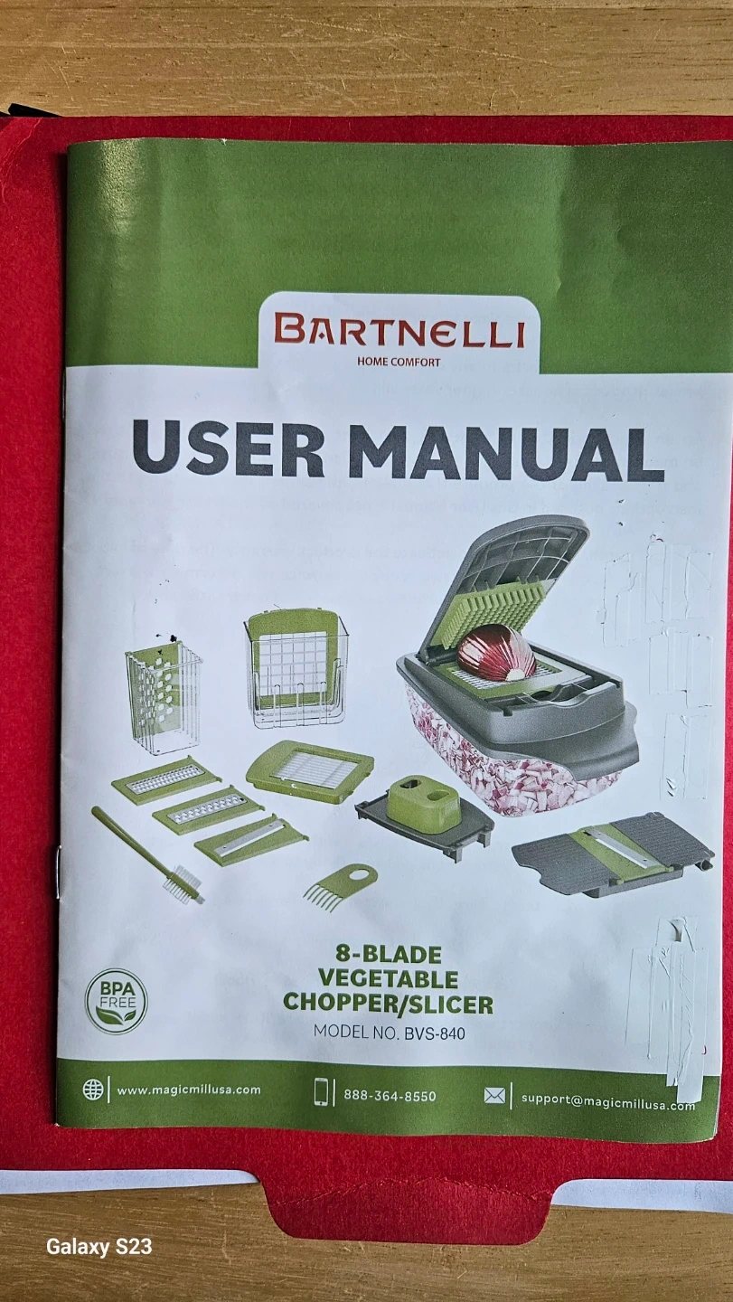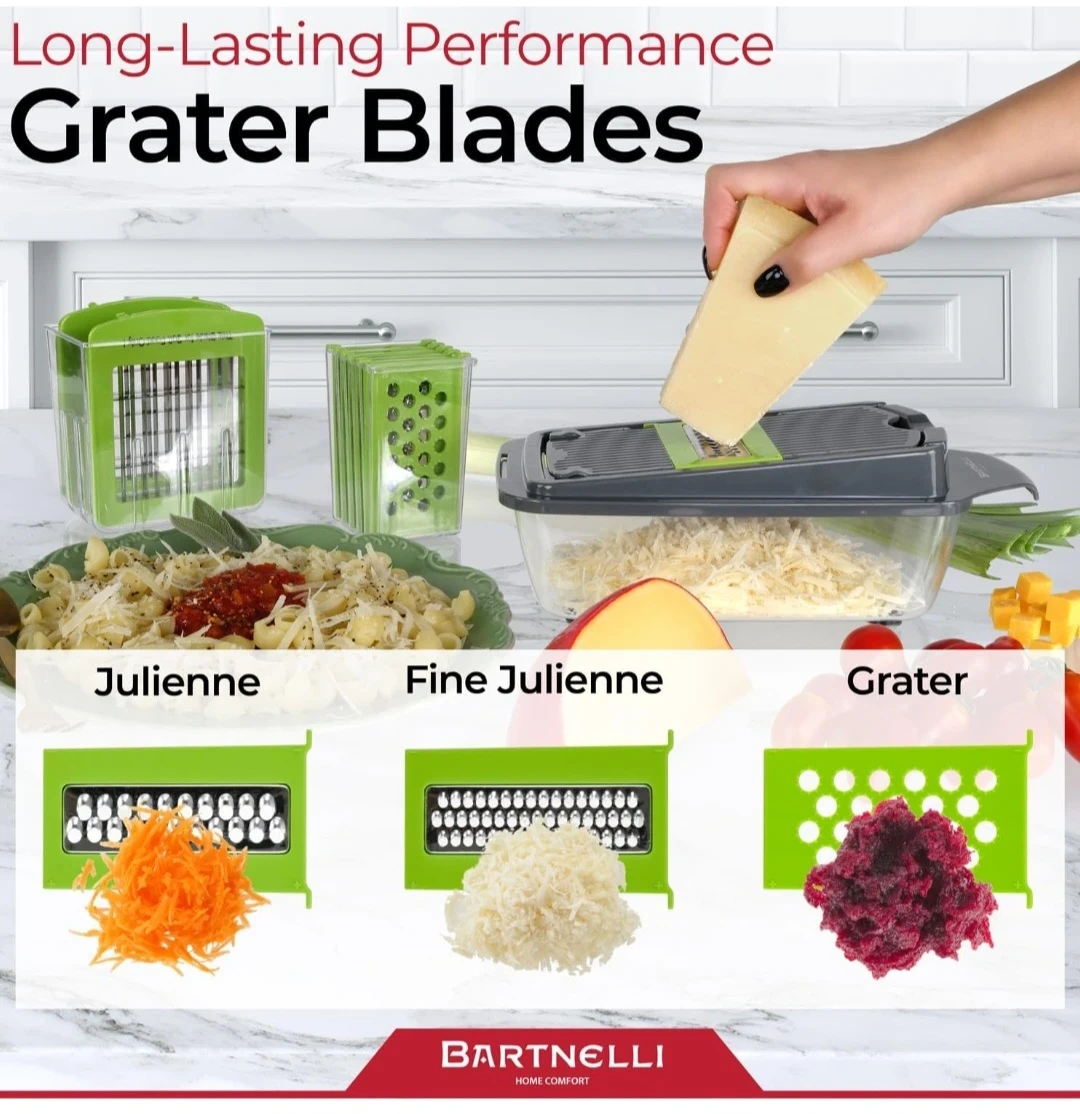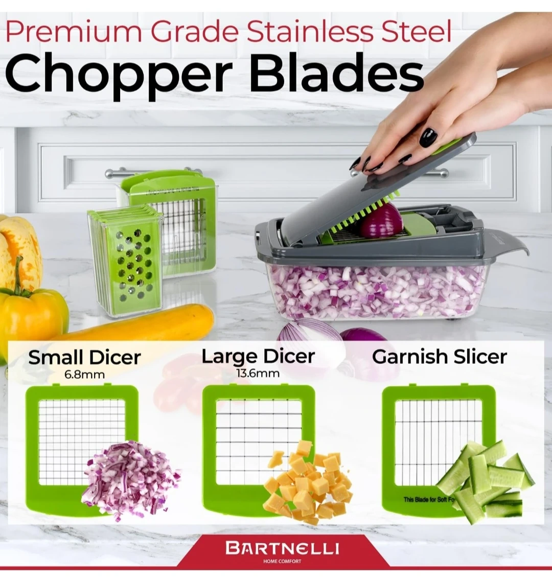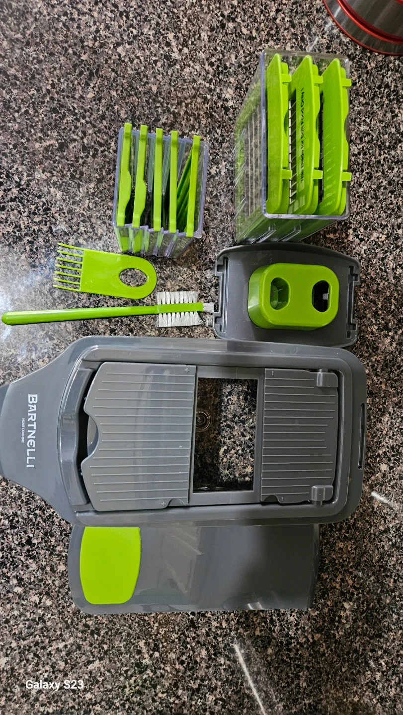 I'm selling a new (just used twice) Bartnelli 15-piece kitchen tool set! This set includes everything you need in a single kitchen tool. It's dishwasher safe and features premium grade stainless steel chopper blades. The set includes a small dicer, large dicer, garnish slicer, julienne, fine julienne, and grater blades.
