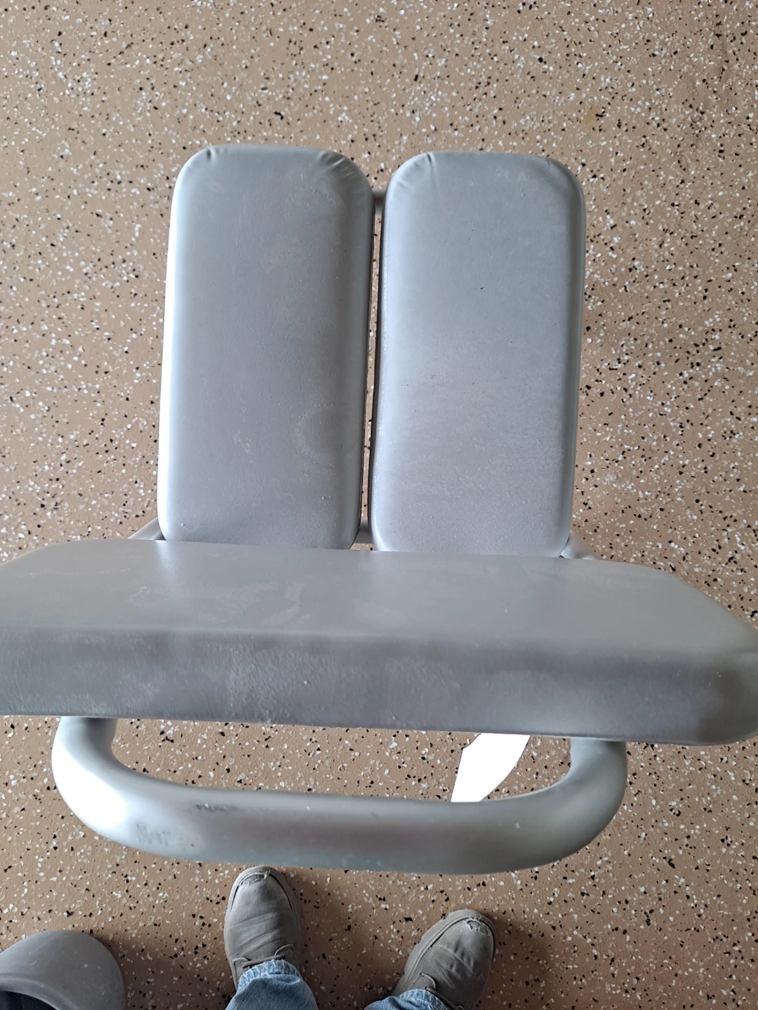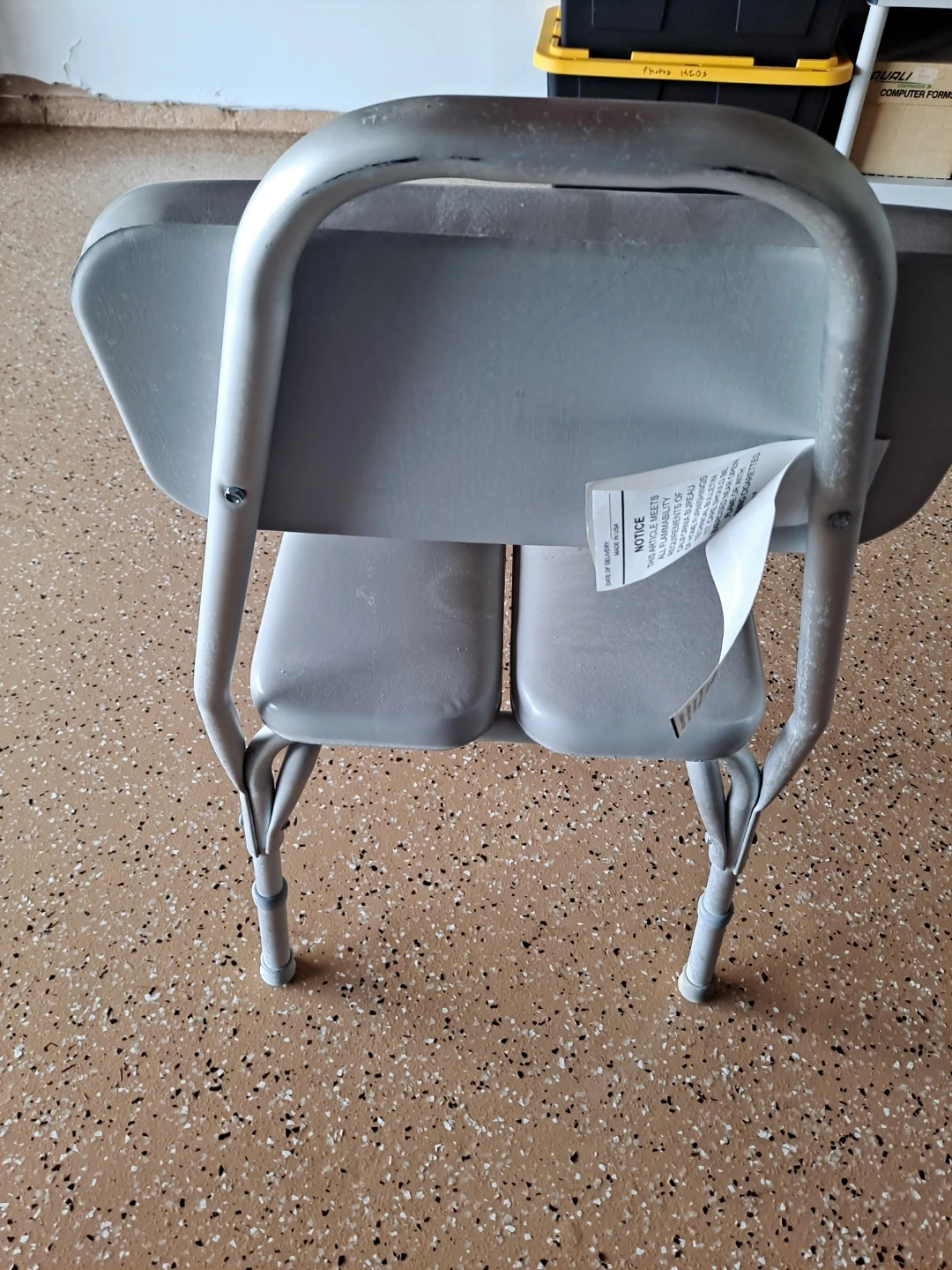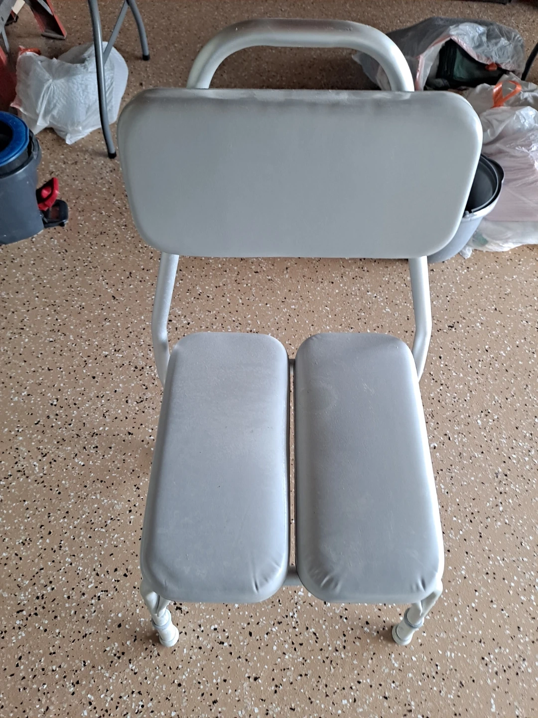 This is a gray shower chair with a backrest and two padded seats. It's designed for use in the shower. It's made of metal with padded seating. This chair is helpful for individuals who need support while bathing.